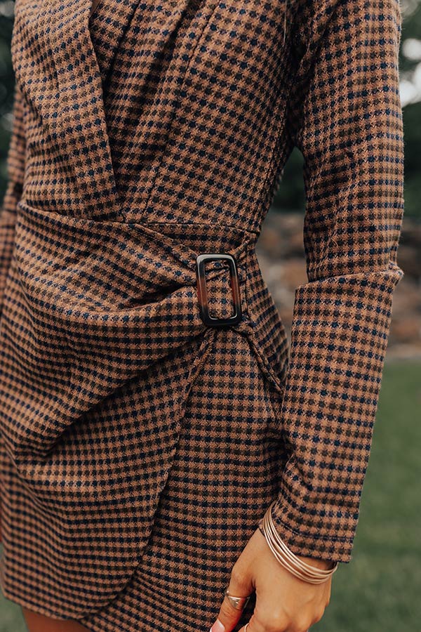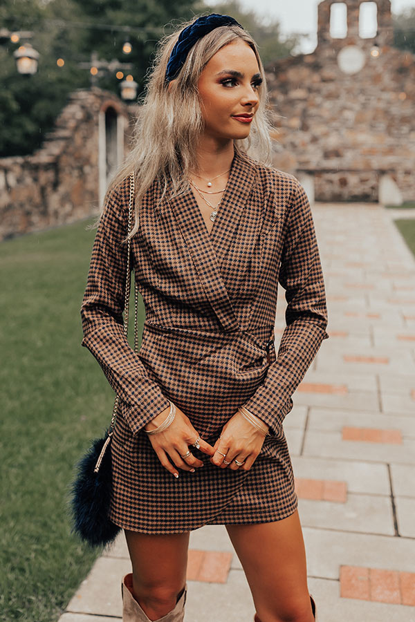 Channel your inner girl boss in our adorable 'Manhattan' dress featuring lightweight material patterned with a chocolate colored houndstooth print, a faux wrap bodice with a collared v-cit neckline, a matching belt waistline, long sleeves, and a flattering silhouette that ends in a straight mid-thigh length hemline!