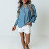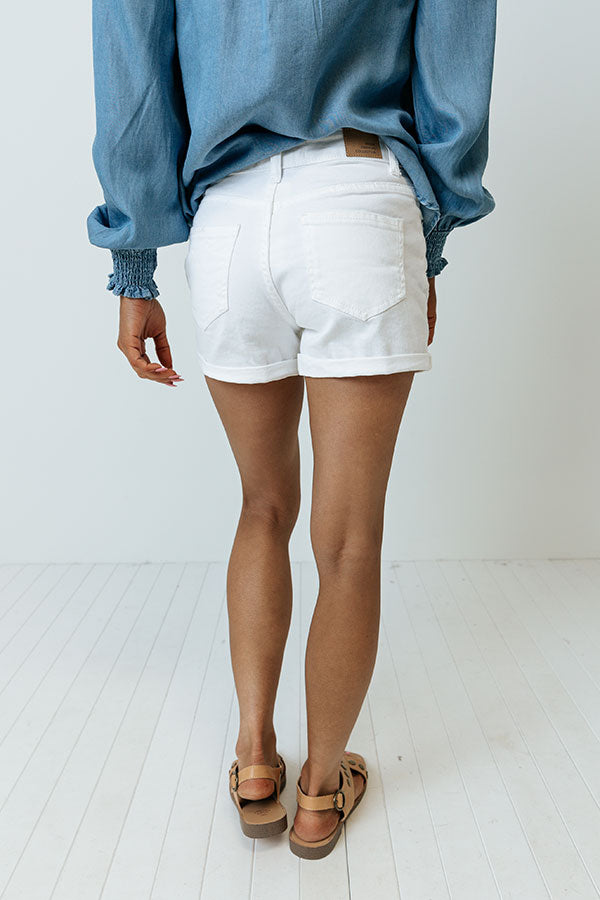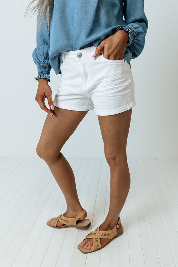 Keep your spring wardrobe versatile with our cute white 'Marrin' shorts featuring lightweight material, a high waistline with belt loops, a classic four pocket cut, a hidden zip fly with a button closure, and a figure hugging silhouette that ends in straight upper-thigh length cuffed hemlines!