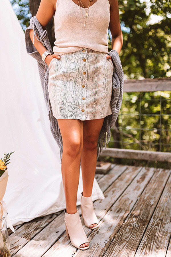 Let your OOTD run free in our striking "Mattie" skirt featuring lightweight material patterned with a neutral/grey snake print, a button down front, accent side pockets, and a figure flattering silhouette that falls into a straight upper-thigh length hemline! We have styled this adorable transitional piece with a matching tank layered under a knit cardigan, a wool hat, neutral peep toe booties, and a brown fringe tote, but you can also wear it with your fave graphic tee and trendy sneakers for a more edgy look! Measurements