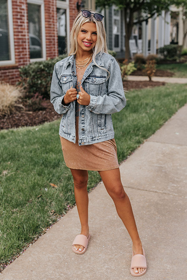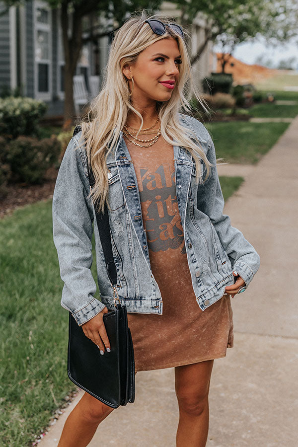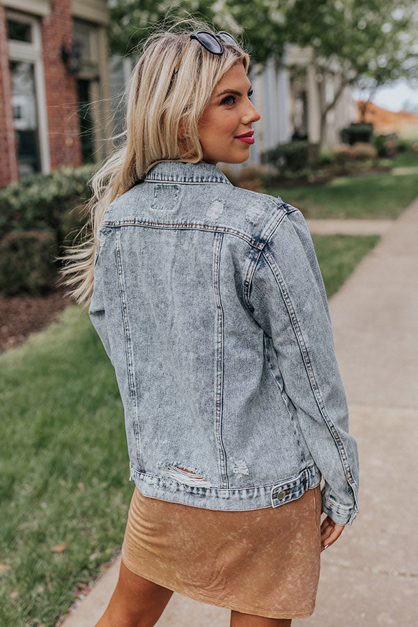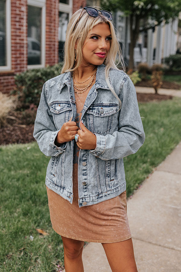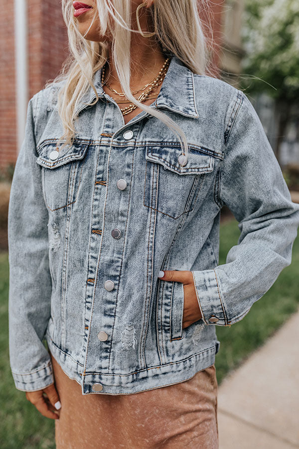 Your seasonal outfits will be envied when you complete your look with 'The Meaux' denim jacket featuring lightweight light wash material with subtle accent fading, a button down front with a collared neckline, two chest pockets with flap closures, long loose sleeves button closure cuffs that can be rolled, and a relaxed silhouette that falls into a straight hemline! Measurements