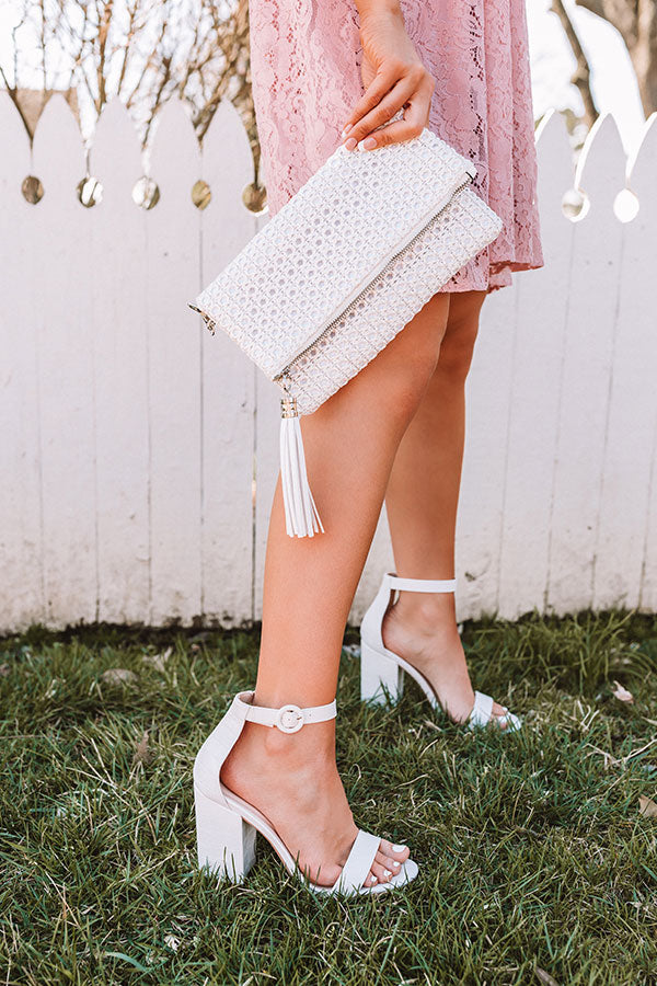 Stay looking trendy while having the summer of your life with our adorable white "Melina" heel featuring sleek faux leather material with snake print texturing, 4-inch block heels, over-the-foot straps, rounded open toes, and a closed heel with buckled ankle straps!