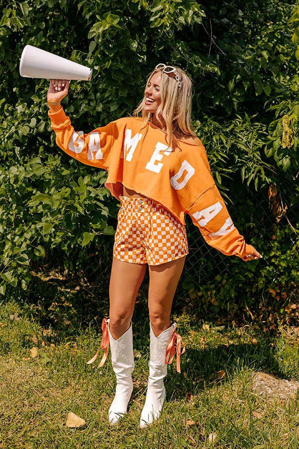 - Step into vibrant style with these fabulous shorts! With a super cute checkered print and a trendy design, they ensure you stand out from the crowd. Whether you pair them with your favorite band tee or create a stylish game day look that is uniquely your own, these adorable shorts are perfect for letting your playful side shine. Show your team spirit whether it's Tennessee Volunteers or Texas Longhorns. - Unlined denim material with a checkered print - A wide, elastic banded waistline with belt loops and subtle ruffle detailing - A hidden zip fly and double button closure - Functional side pockets - A relaxed yet flattering silhouette that ends in upper-thigh length hemline
