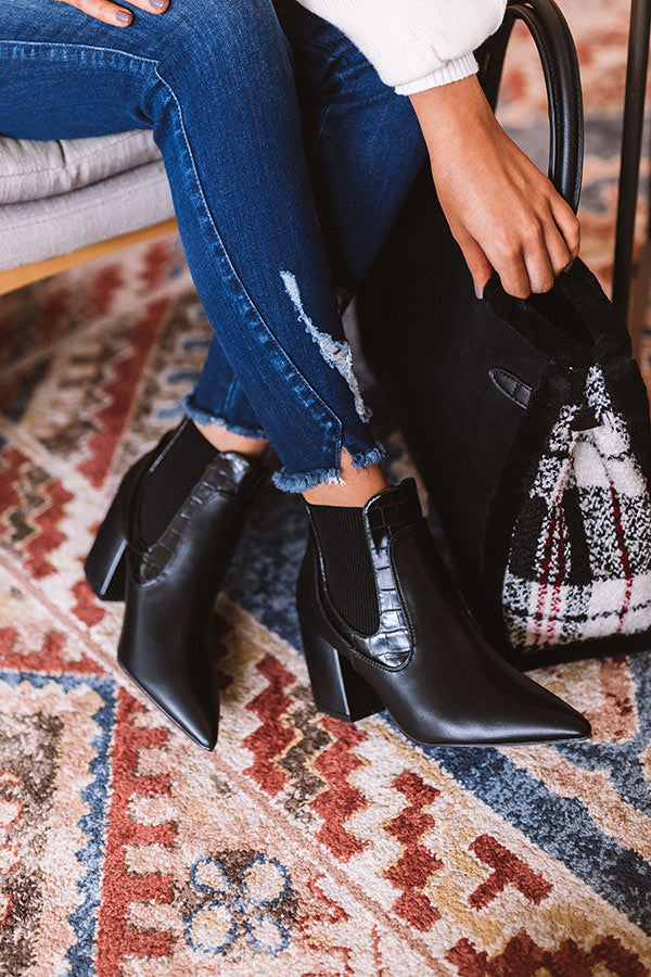 Everyone is sure to hear you coming when you wear our chic black "Moira" bootie featuring sleek faux leather material with subtle snake print texturing, 3-inch block heels, pointed closed toes, elastic detailing on the sides, and a lightweight slip-on silhouette! This bootie runs more true to size.