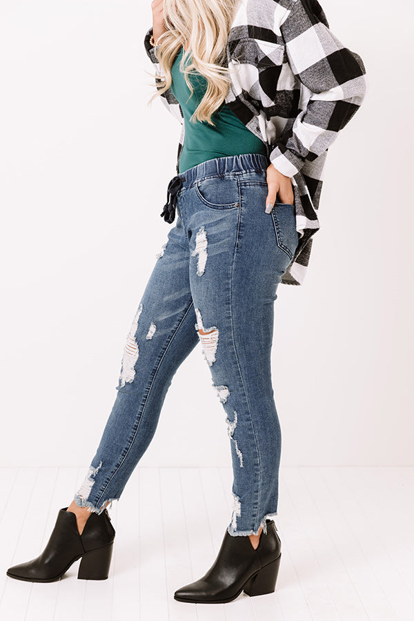 Life is more than just fitting into your jeans, but we believe you will LOVE the look and feel of our adorable "Moore" skinnies featuring lightweight medium wash denim material with distressed detailing and accent fading, four pocket cuts, a hidden zip fly with a button closure, an elastic midrise waistline with a tie belt, and a form fitting silhouette that falls into frayed ankle-length hemlines that can be cuffed!