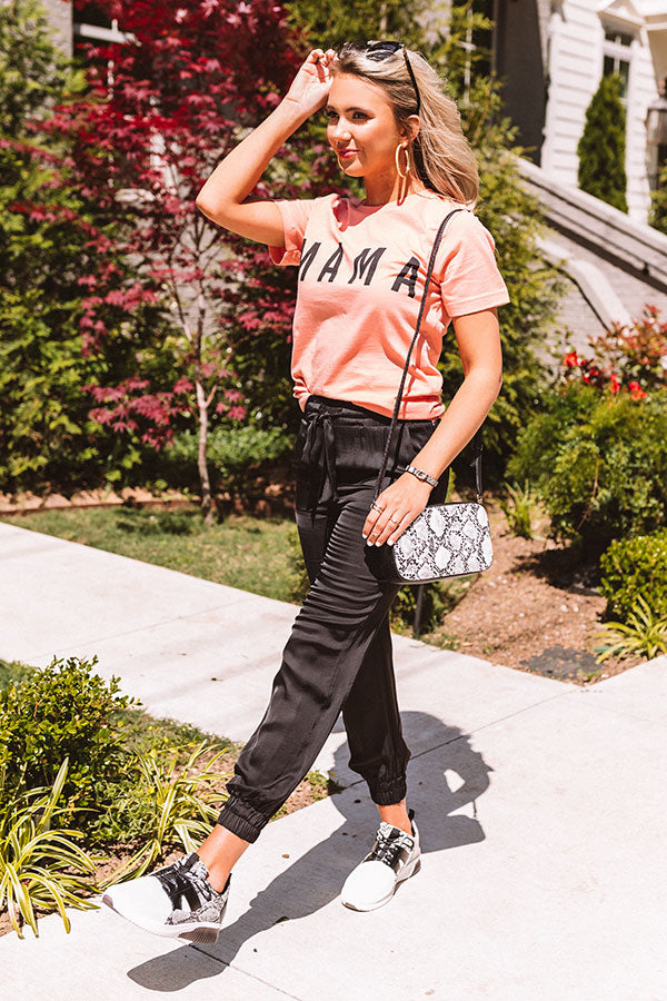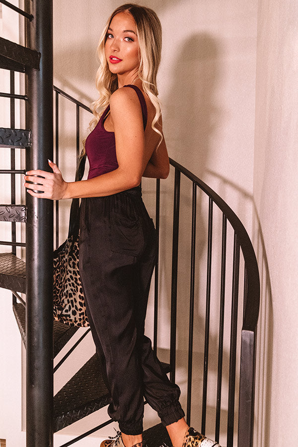 Stay chic AND cozy in our black "Nicola" joggers featuring sleek lightweight satin material, a wide smocked waistline with a tie belt closure, four accent side and back pockets, and a relaxed pants silhouette that falls into fitted ankle length hemlines! You can style these cuties up with a windsor wine colored bodysuit and trendy leopard sneakers, or you can dress them down with a basic white tee under a cropped jean jacket, our white "Camber Perforated Bootie," black sunnies, and our "Right On Cue Fringe Crossbody in White!" Measurements