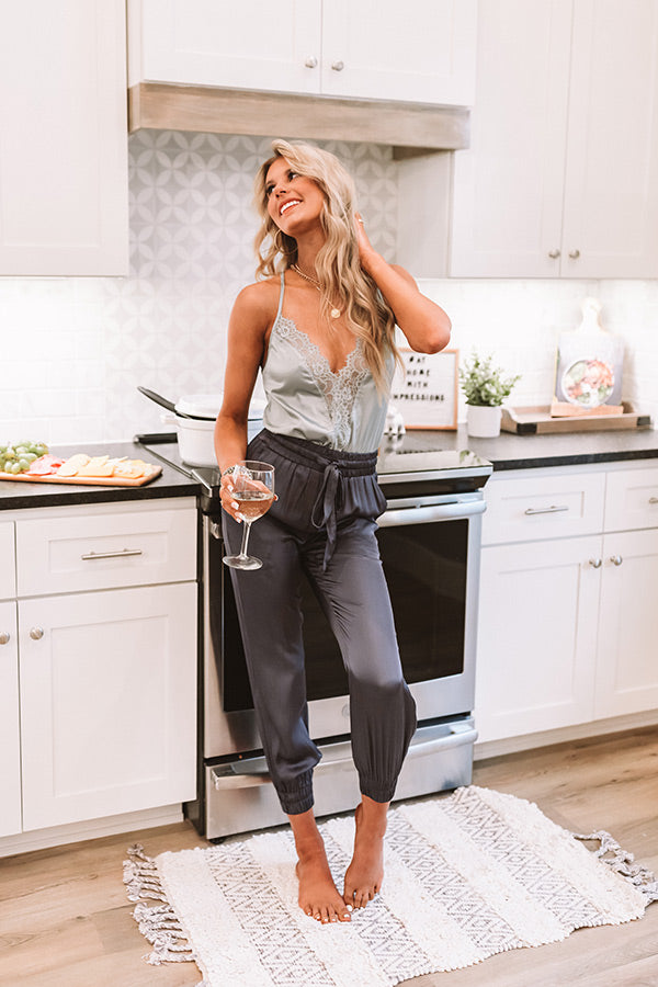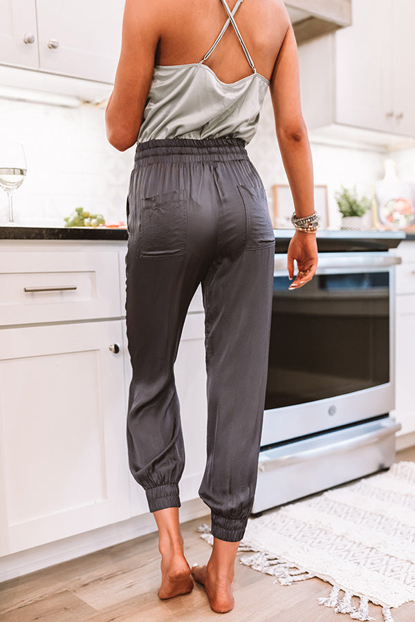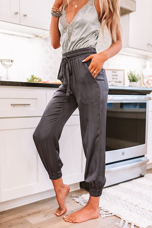 Stay chic AND cozy in our charcoal colored "Nicola" joggers featuring sleek lightweight satin material, a wide smocked waistline with a tie belt closure, four accent side and back pockets, and a relaxed pants silhouette that falls into fitted ankle length hemlines! You can style these cuties up with a satin bodysuit, or you can dress them down with a basic white tee under a cropped jean jacket, "The Linden Camo Sneaker," sunnies, and "The Essential Faux Leather Backpack in Black!" Measurements