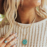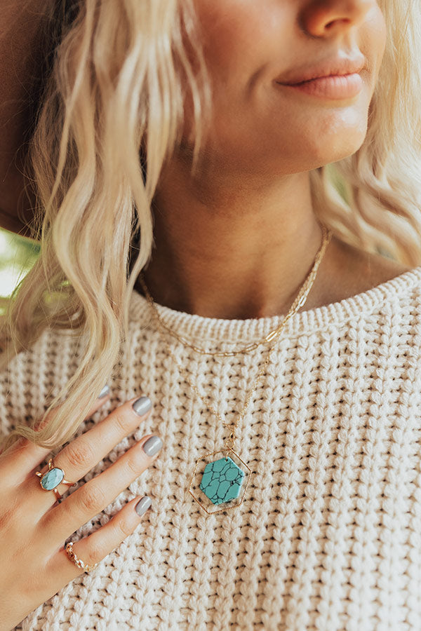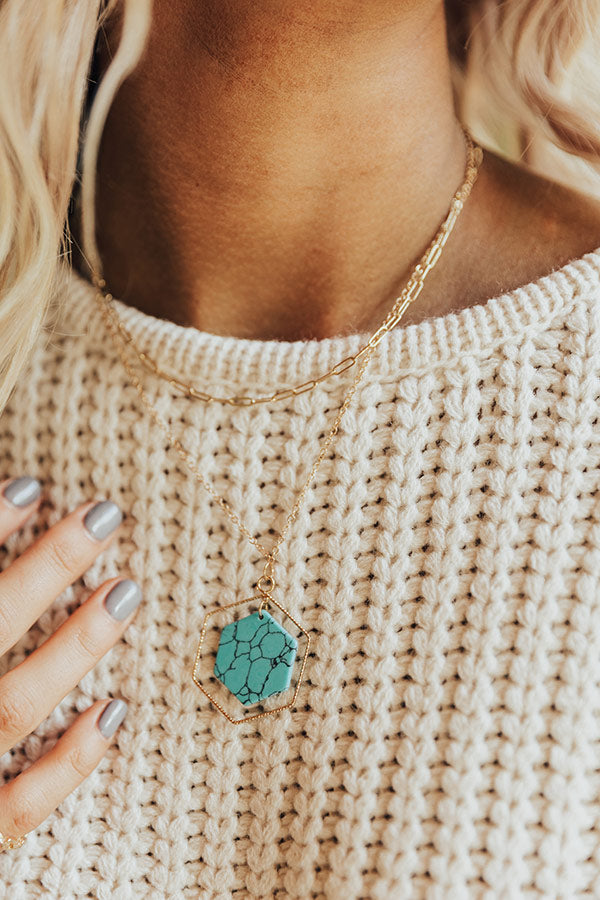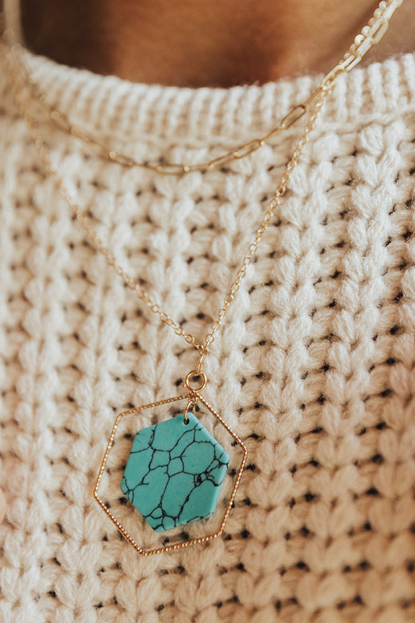 You are sure to get some attention when you add a pop of color with our pretty gold 'The Night Before Necklace' featuring two layered pieces: a shorter clink chain and a longer link chain with a turquoise hexagon stone pendant set inside a dainty hexagon hoop!