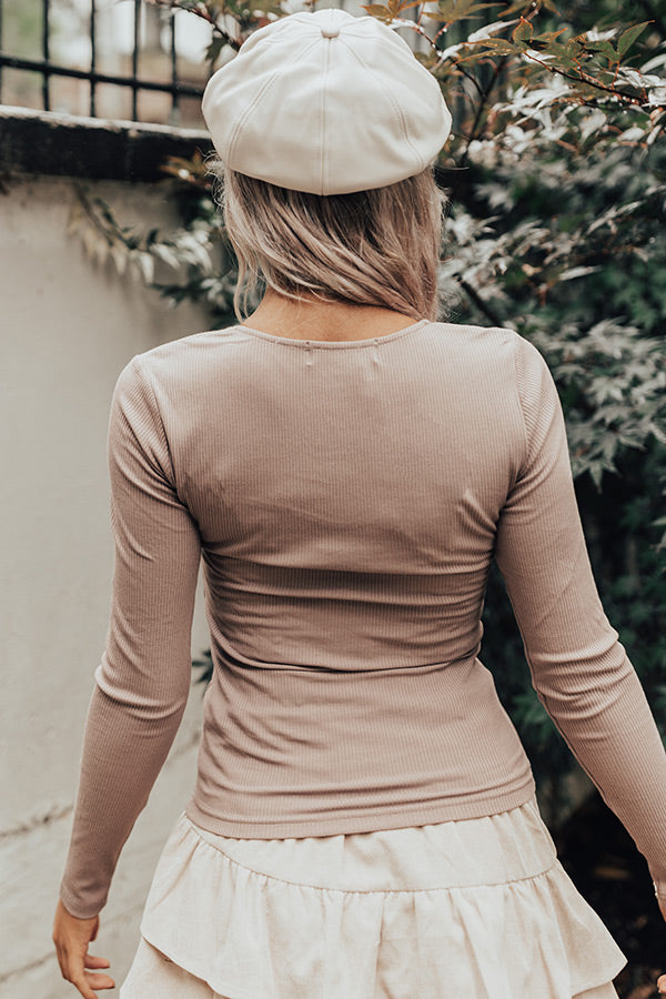 Perfect for layering or wearing solo, our cute dark taupe colored 'The Night Before Top' featuring lightweight stretchy material, a flirty neckline, long sleeves, and a flattering figure hugging silhouette that ends in a straight hemline!