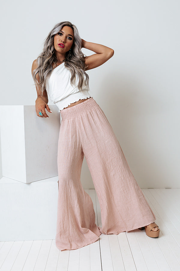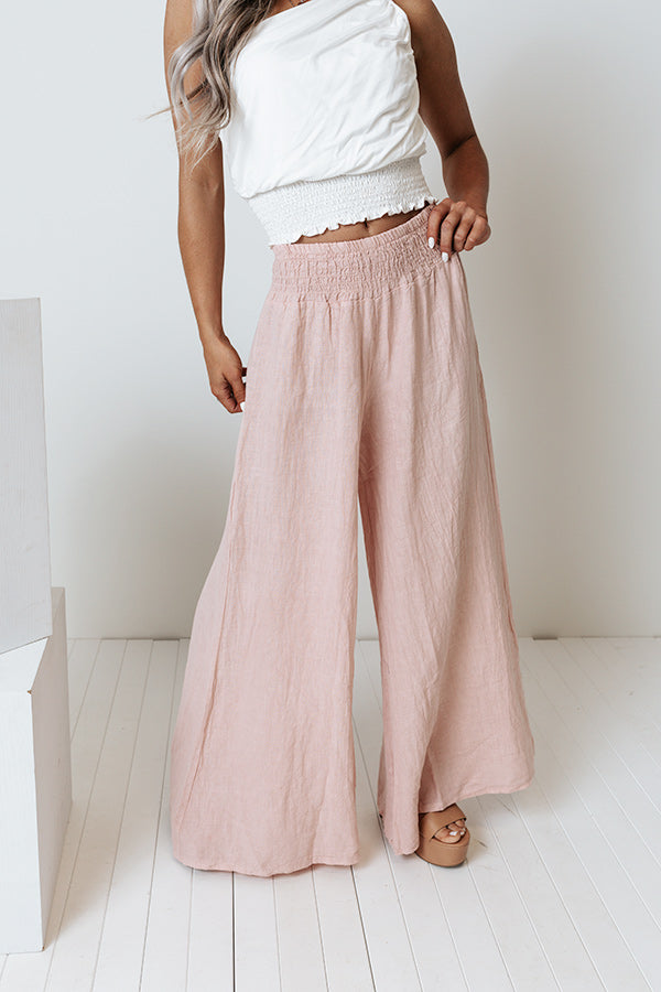 Walk on the fashionable side with our casual pink 'Nirvana' pants featuring lightweight and flowy linen material, a wide high waist elastic waistline, and an oversized silhouette that cascades into flared ankle-length hemlines! Measurements