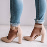 Nude suede heels with a pointed square toe & adjustable ankle strap.