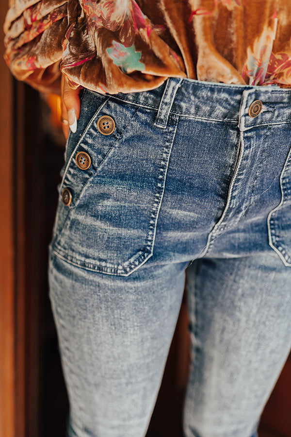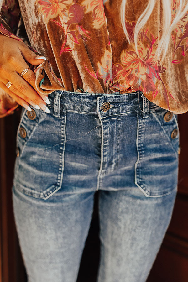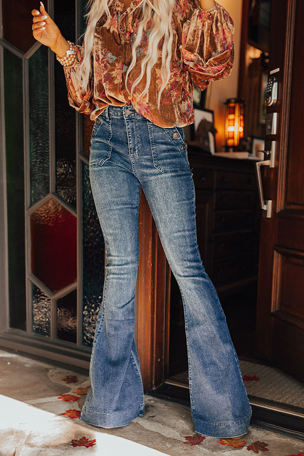 Wow the crowd in our groovy 'Nox' flare featuring medium wash denim material with accent fading, a high waistline with belt loops, a hidden zip fly with a button closure, a classic four-pocket cut with button accents on the front, and a flattering silhouette that ends in straight ankle-length flared hemlines!