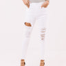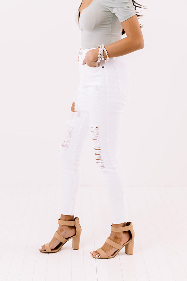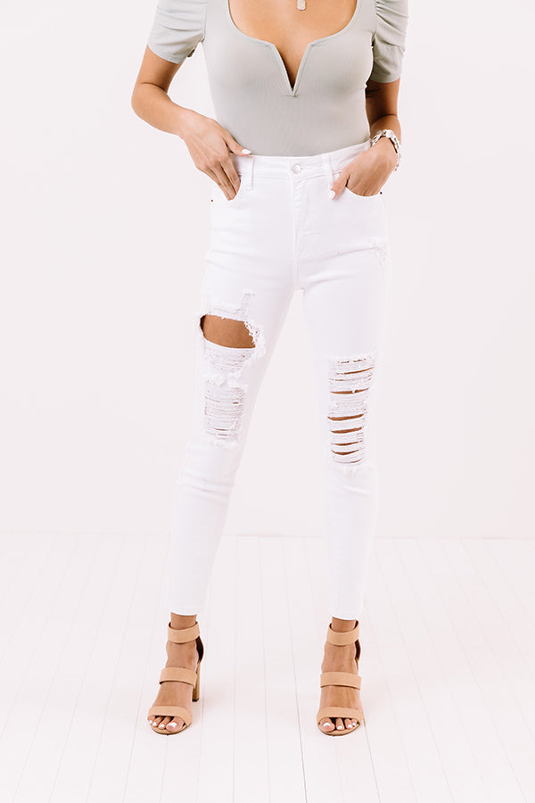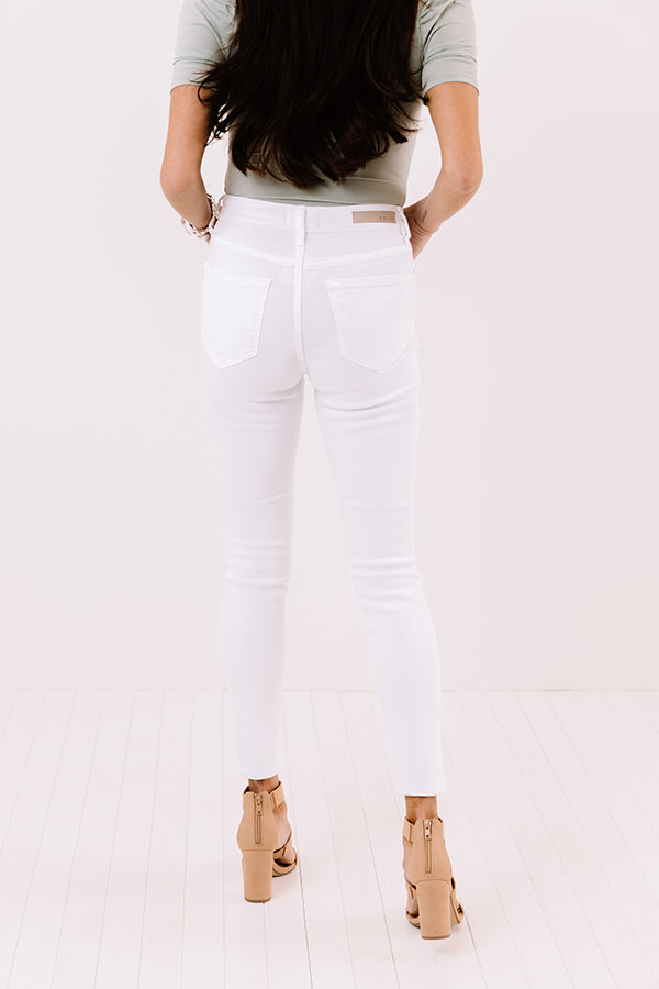 Life is more than just fitting into your jeans, but we believe you will LOVE the look and feel of our chic white 'Nyma' skinnies featuring lightweight denim material with distressed detailing, a high waistline with belt loops, a classic five pocket cut, a hidden zip fly with a button closure, and a form fitting silhouette that falls into straight ankle-length hemlines that can be cuffed!