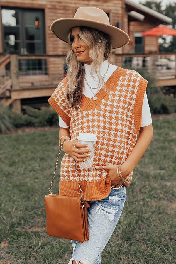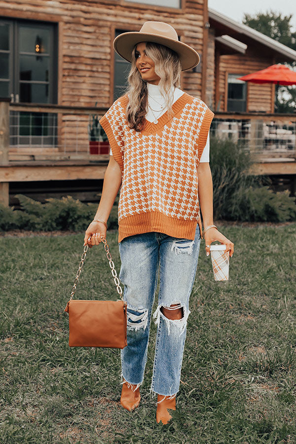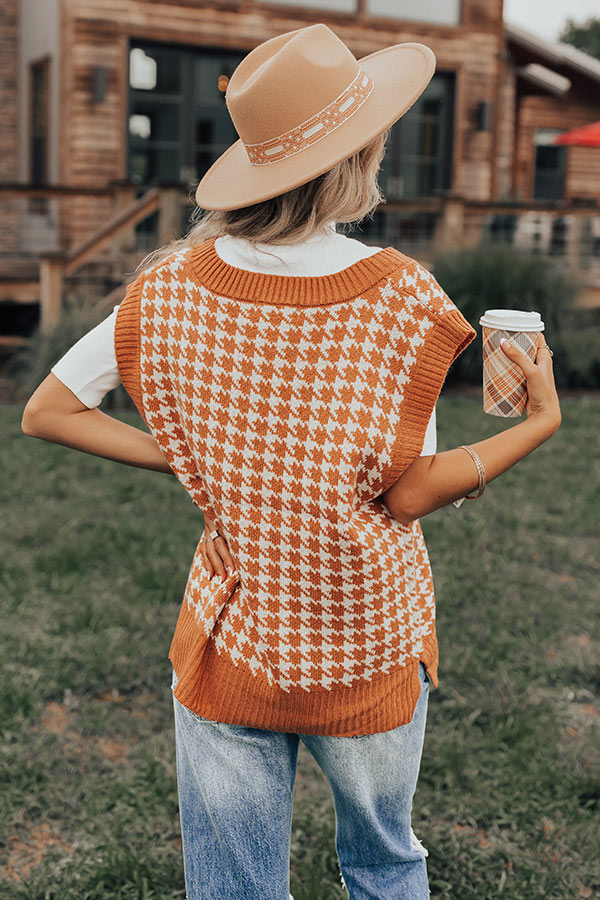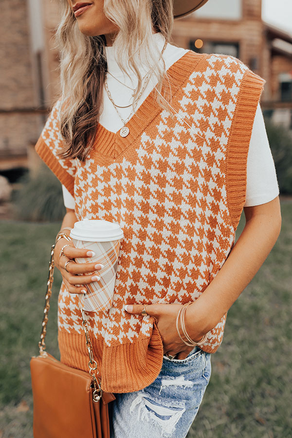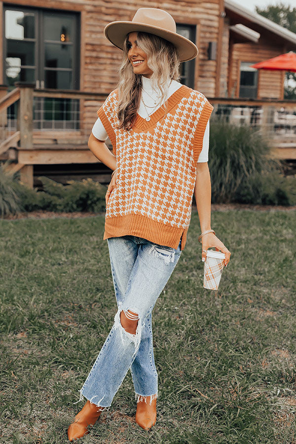Perfect for layering, our adorable 'Oakford' sweater top features soft lightweight knit material patterned with a camel and white houndstooth print, a v-cut neckline, wide sleeveless shoulders, and a slouched silhouette that falls into a straight hemline!