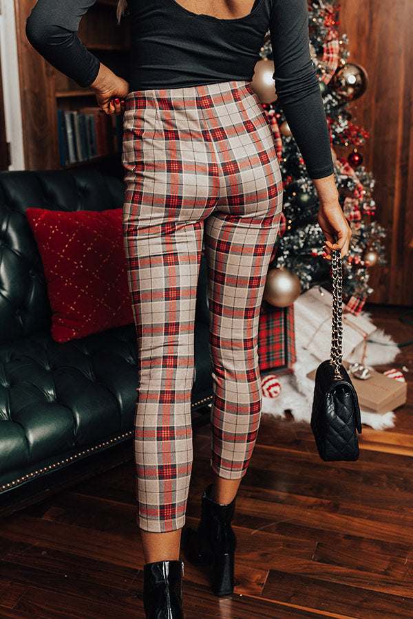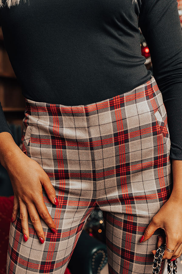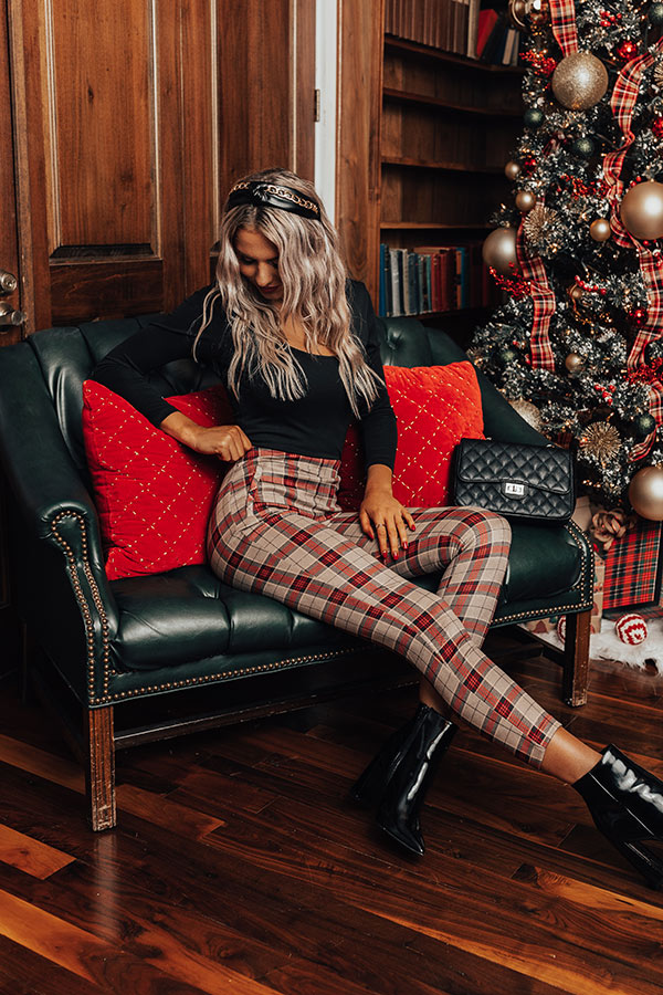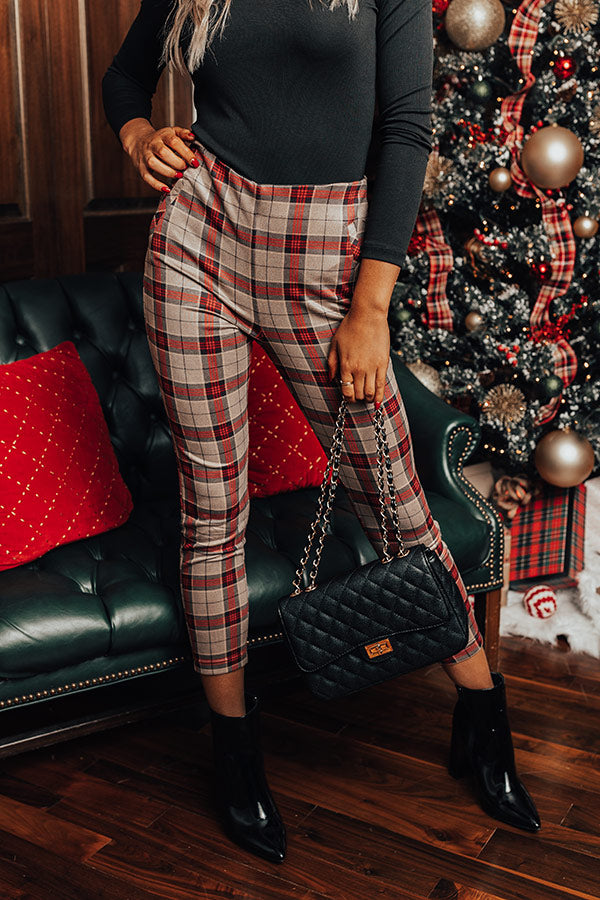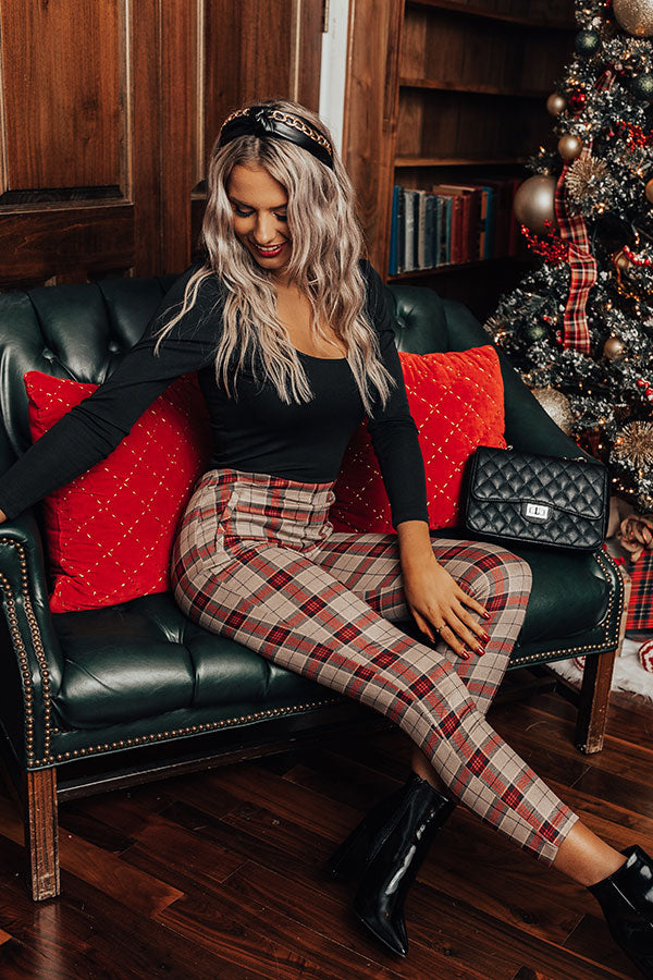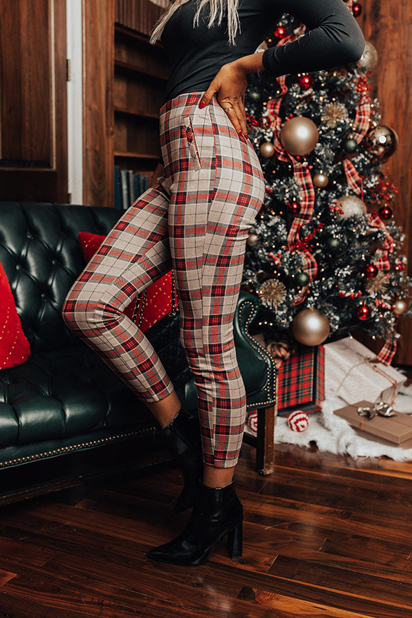 Whether you are headed to the office or a holiday party, our luxe natural hued 'Octavia' pants are perfect for any occasion! They feature lightweight material patterned with a red plaid print, a high waistline with a zip closure, faux pocket cuts on the side, and a flattering figure hugging silhouette that ends in a straight ankle-length hemline! Measurements