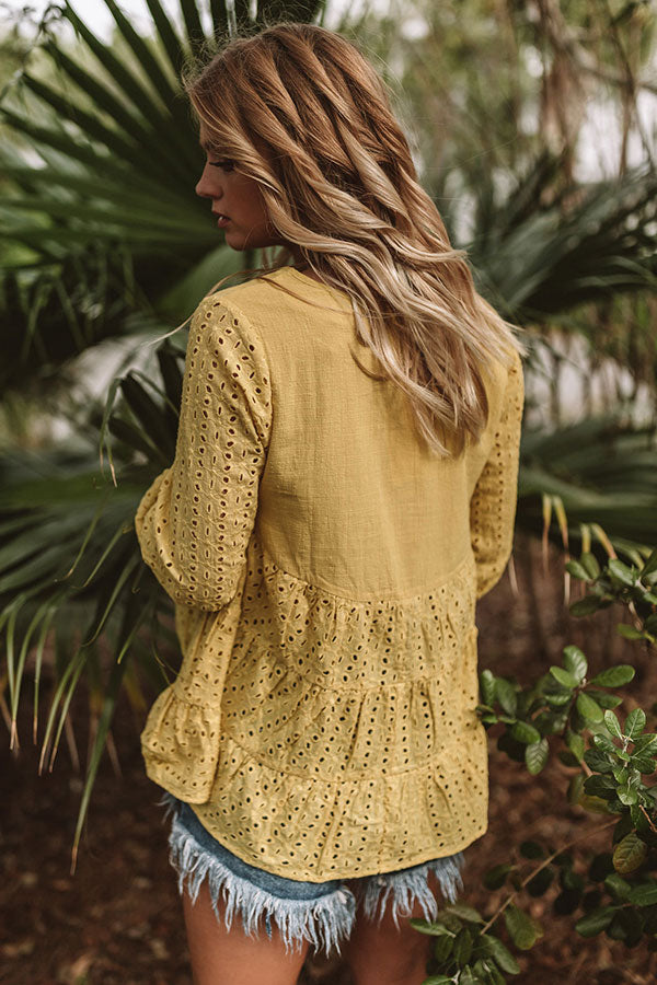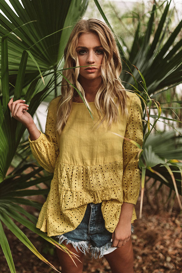 This timeless eyelet top has quarter length eyelet pierced sleeves, & an empire cut upper bodice that falls into an eyelet pierced babydoll hem. Style with your favorite denim, for an effortlessly stylish look that is as sweet as can be!
