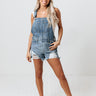 Our adorable 'Paislee' overalls feature lightweight denim material with a medium wash color, a straight neckline with a large accent pocket on the bodice, adjustable 1-inch shoulder straps with snap closures on the front and a v-cut back, belt loops, four pocket cuts on the shorts, and a relaxed shorts silhouette that falls into ultra distressed mid-thigh length hemlines! Measurements
