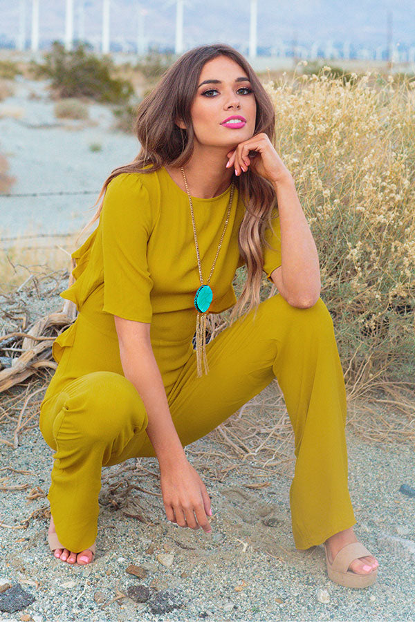 The "Palm Spring Jumpsuit" certainly knows how to bring sexy back! With a sophisticated front and sassy ruffled open back... This jumpsuit is the perfect blend of class & sass!