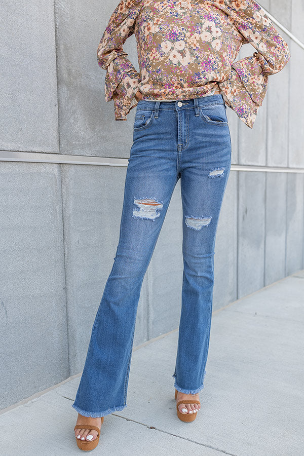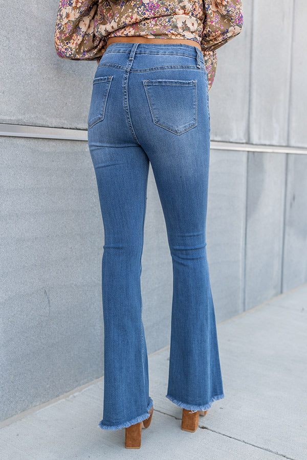 Stay groovy in our trendy 'Patisserie' flare featuring lightweight dark wash denim material with accent fading and distressed detailing, a high waistline with belt loops, a hidden zip fly with a button closure, and a flattering silhouette that ends in flared ankle-length hemline with frayed trim detailing!