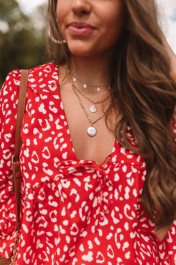 This beautifully layered accessory features 3 golden necklaces, a short one with ivory charms, a medium length one with a gold pendant, and a long one with a mother of pearl charm!