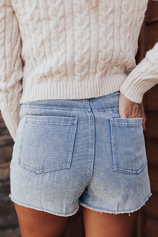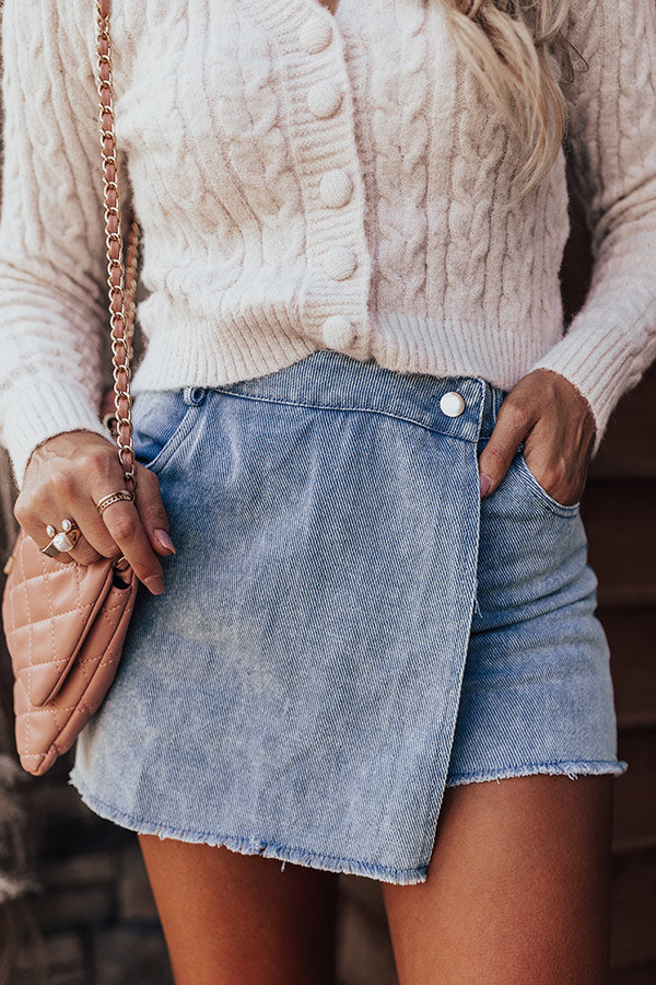 Make transitioning from season to season easy with our flirty 'Penlee Skort' featuring light wash denim material, an overlay front flap with an asymmetrical button closure waistline, belt loops, two side pockets and back pockets, and a flattering silhouette that ends in straight upper-thigh length hemlines! Measurements