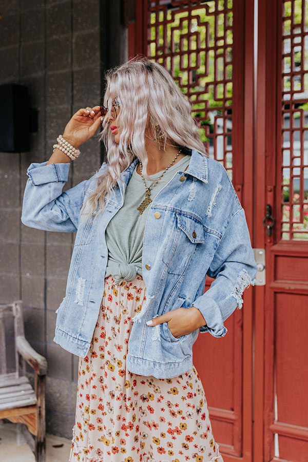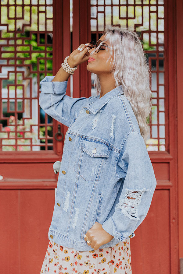 Your seasonal outfits will be envied when you complete your look with 'The Percy' denim jacket featuring lightweight light wash material with subtle accent fading and distressed detailing, a button down front with a collared neckline, two chest pockets with flap closures, long loose sleeves button closure cuffs that can be rolled, and a relaxed silhouette that falls into a straight hemline!