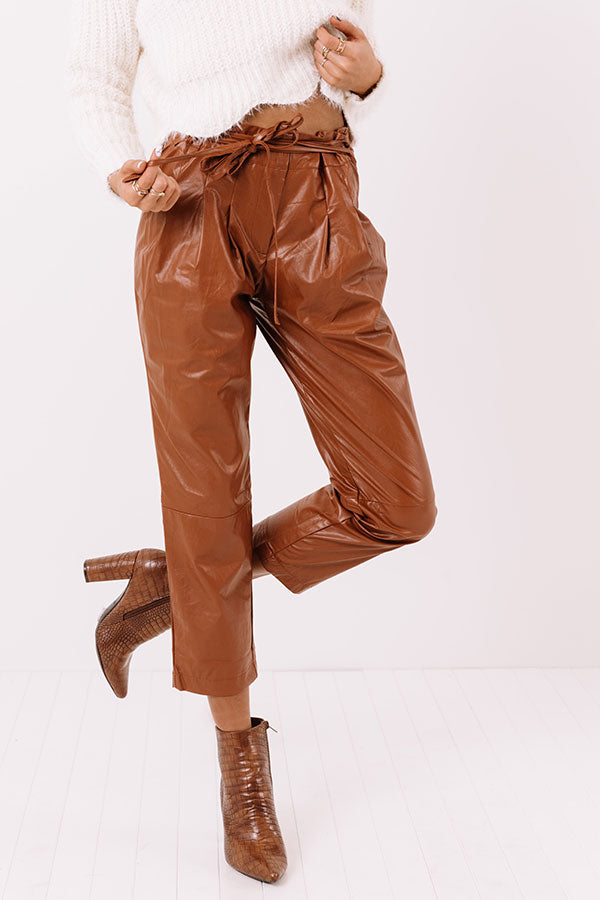 Step up your wine to wine style game with our chic cinnamon colored 'Persia' pants featuring sleek lightweight faux leather material, a pleated front waistline with a tie belt, two back pocket cuts, and a flattering trouser silhouette that falls into straight lower-calf length hemlines!