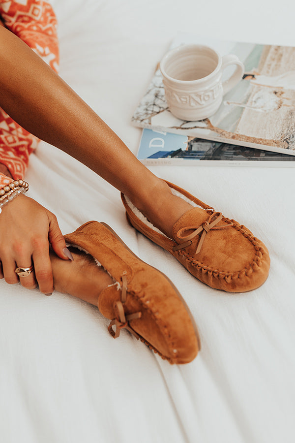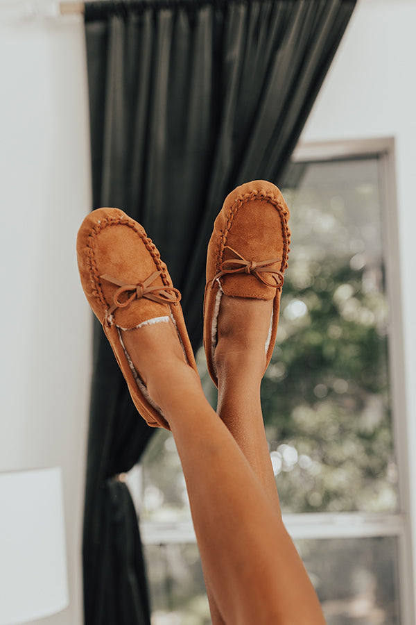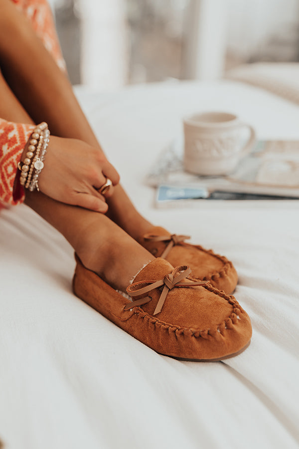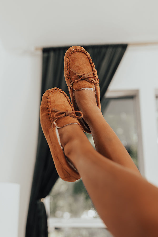 Take on any day in our comfy but practical camel colored 'Pip' slipper featuring faux suede material with soft faux fur lining, a rounded closed toe, a flat sole, an accent bowtie on he top, and a lightweight slip-on moccasin silhouette! This slipper runs more true to size.
