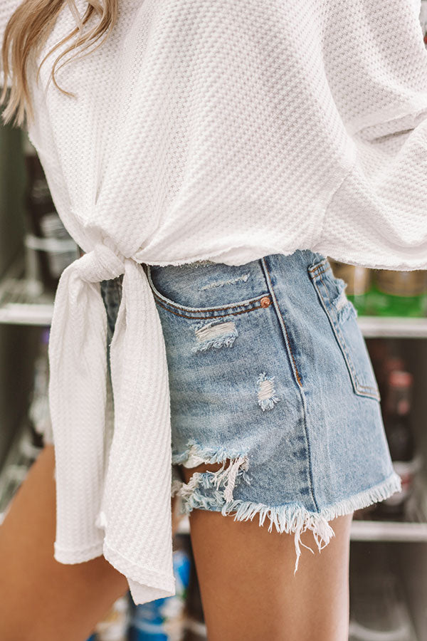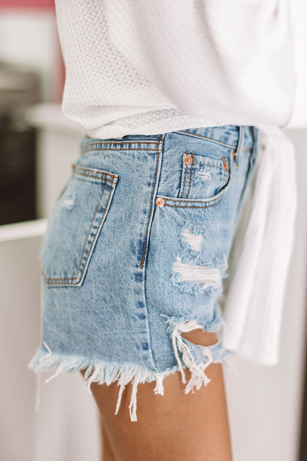 Dress to impress in our adorable "Pixie" denim shorts featuring lightweight stretchy denim material, a light wash color, distressed detailing, a high waist fit, a hidden zip fly with a button closure, belt loops, five pocket cuts, and a relaxed silhouette that falls into ultra frayed straight raw cut upper thigh length hemlines! Style with your favorite basic tee, tank, or lightweight sweater, an oversized tote or a crossbody, sunnies, and some neutral wedges or colored sandals for the most relaxed summer look yet! Measurements