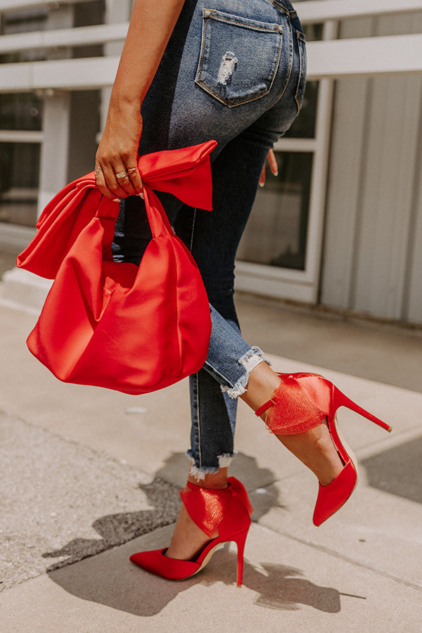 Designer inspired and stunning, our chic red 'Porter' heel features sleek satin material, a pointed closed toe, a 4.5-inch heel height, a closed heel with a tulle bow accent, and a buckled ankle strap! This heel runs more true to size.