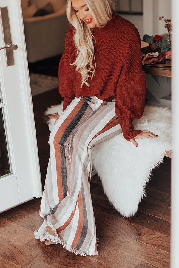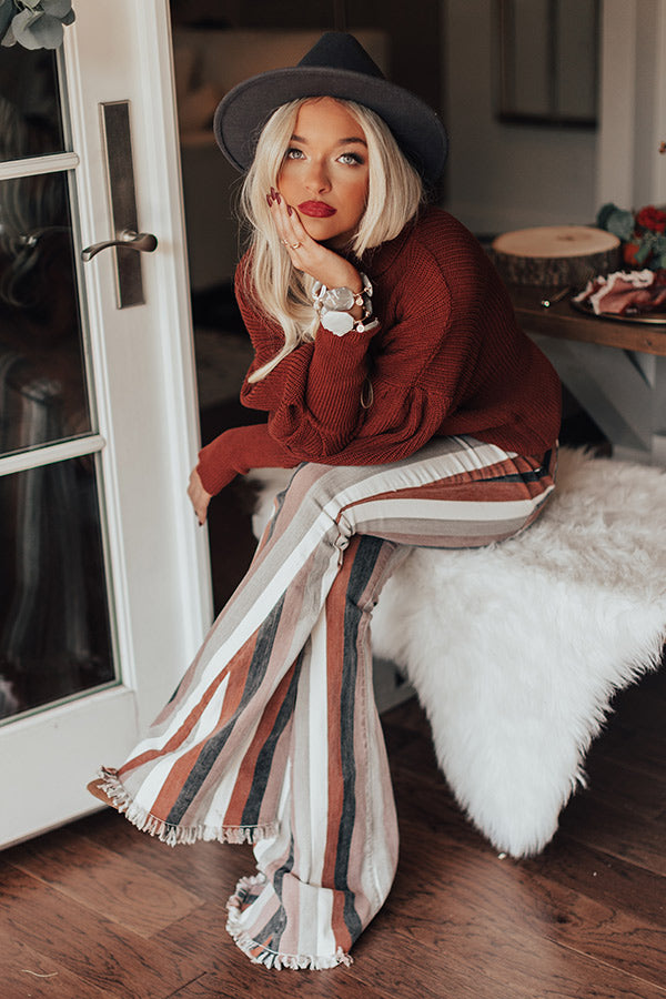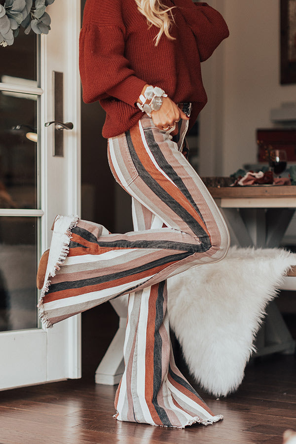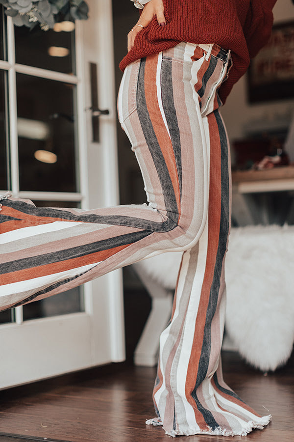 Stripe right on these adorable flares! The Praline High Waist Stripe Flare brings us all the fall vibes with its rust, neutral, white, and black stripe design. These flares feature a fitted leg, bell bottoms, and a raw hemline. Measurements