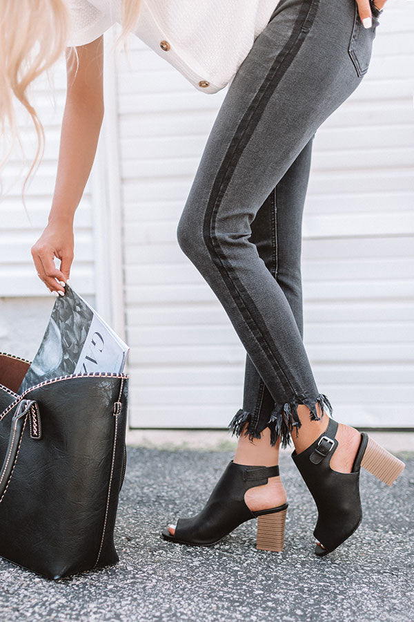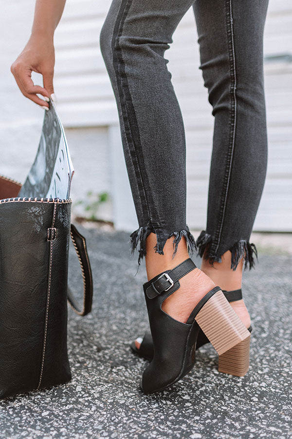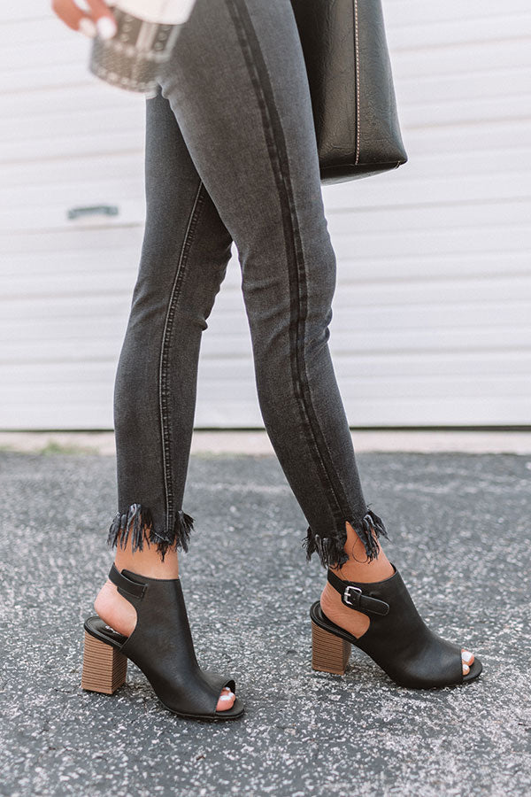 We have found the perfect summer to fall transitional shoe in "The Pryor Faux Leather" bootie in black with a peep toe, block heel, open back with a buckle heel strap!