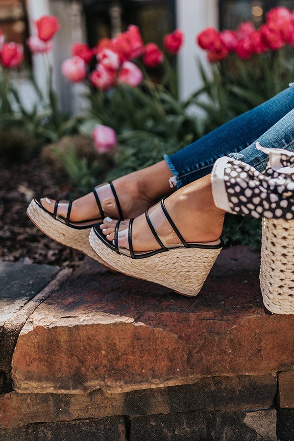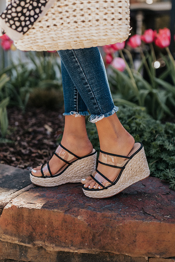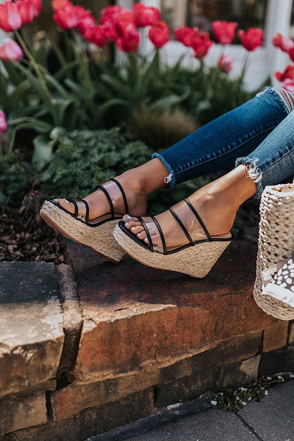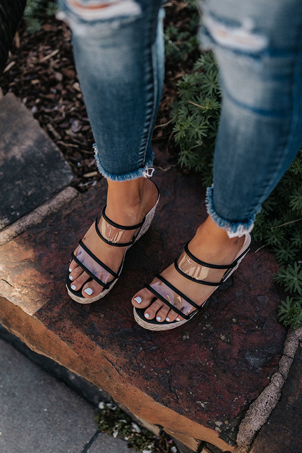 You won't find a more chic warm weather shoe than our trendy black 'Raela Wedge' featuring two clear over-the-foot straps, a rounded open toe, a 4.5-inch wedge height, and a lightweight slip-on silhouette! This wedge runs more true to size.