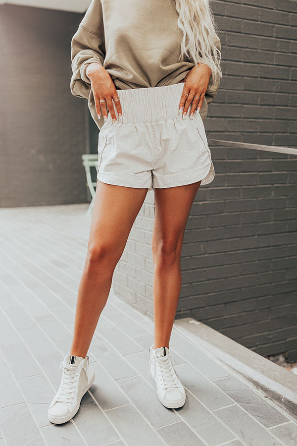 Step up your athleisure game with our trendy stone colored 'Rainier' shorts featuring lightweight windbreaker material, a wide and high elastic waistline, and a sporty silhouette that ends in straight upper-thigh length hemlines!