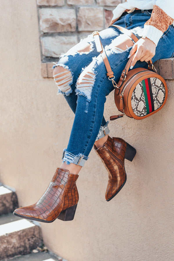 Step into fall in style with "The Ramsey" cinnamon colored bootie featuring sleek faux leather material with a gator print pattern, 2.5-inch block heels, inside ankle zippers, pointed closed toes, and an ankle length height!
