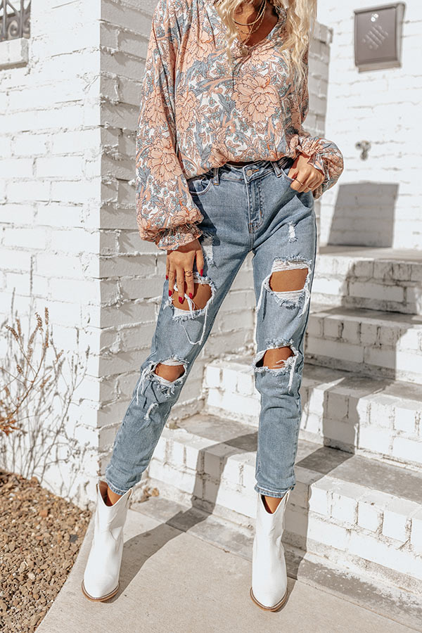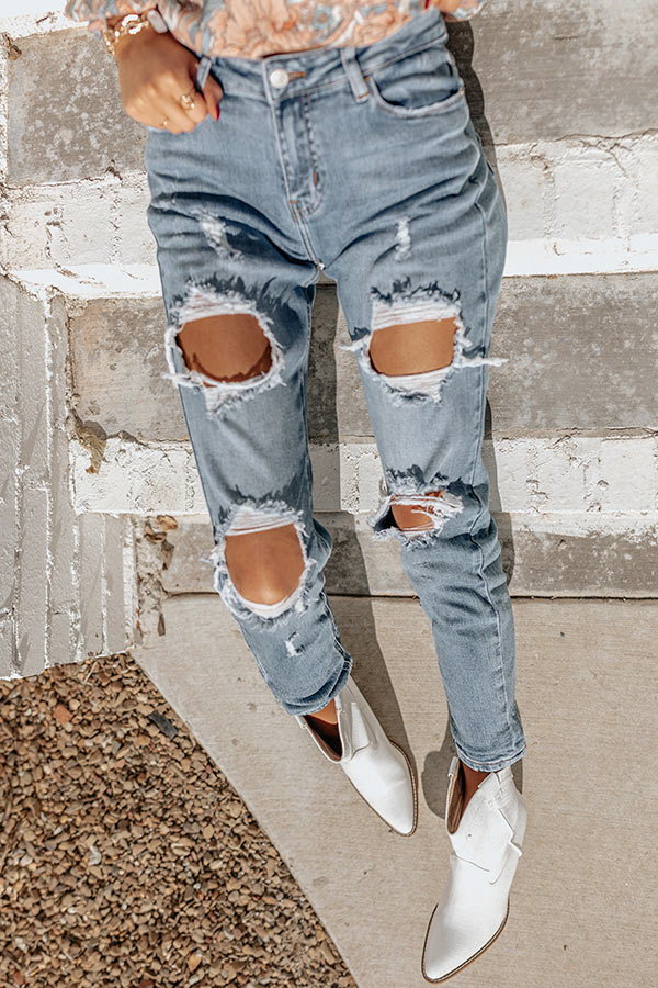 Add a bit of edge to your wardrobe with our trendy 'Ravine' skinny featuring light wash denim material with ultra distressed detailing, a high waistline with a belt loops, a hidden zip fly with a button closure, a classic five pocket cut, and a relaxed silhouette that ends in cuffed ankle-length hemlines! Measurements