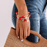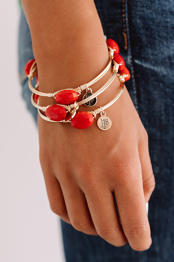 The "Rayna" bracelet features a gold plated copper wire-wrapped bangle adorned with three scarlet acrylic pieces!