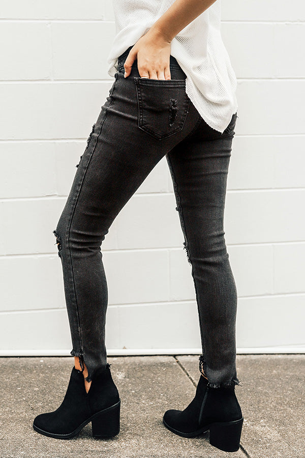 These stone washed black distressed skinny jeans have a mid-rise fit, a great stretchy feel, a skinny fitted pant leg & a frayed step hem.
