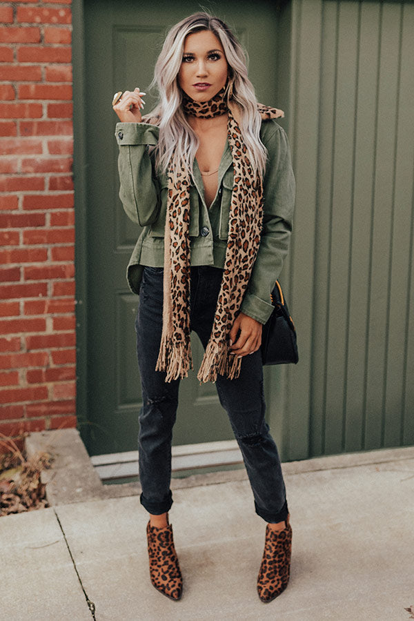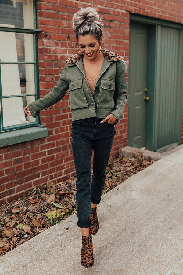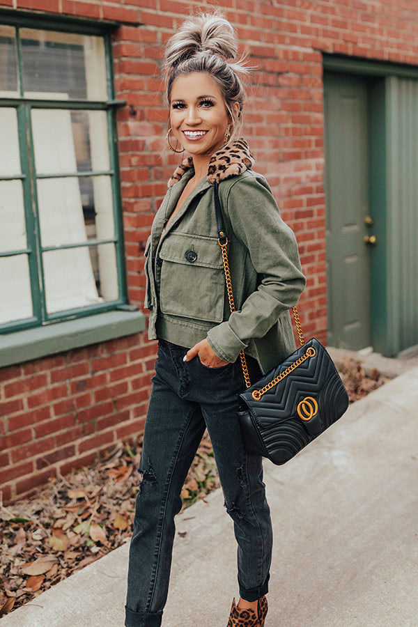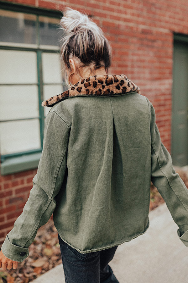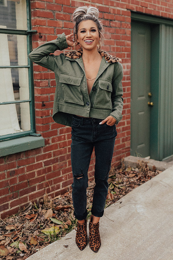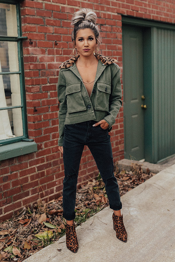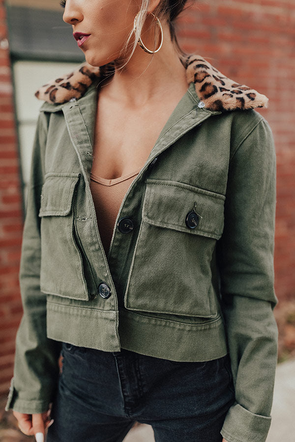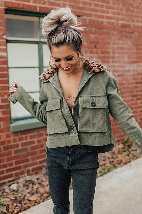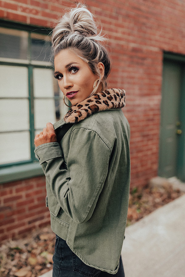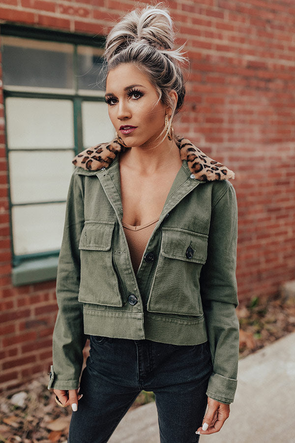 This adorable olive hued cargo jacket is "the real deal" with its lightweight material, faux fur collared neckline patterned with a bold black and brown leopard print, long loose sleeves with fitted button closure cuffs, two large front flap accent pockets, and a relaxed button up silhouette that falls into an uneven cropped hemline! You can layer this ultra warm and versatile piece with just about anything from a basic tank to a sweater, jeans to skirts or dresses, booties to wedges or sandals, clutches to totes, and hats to earrings! Measurements