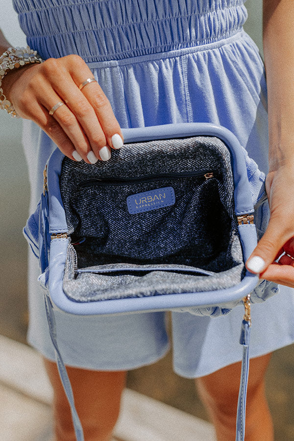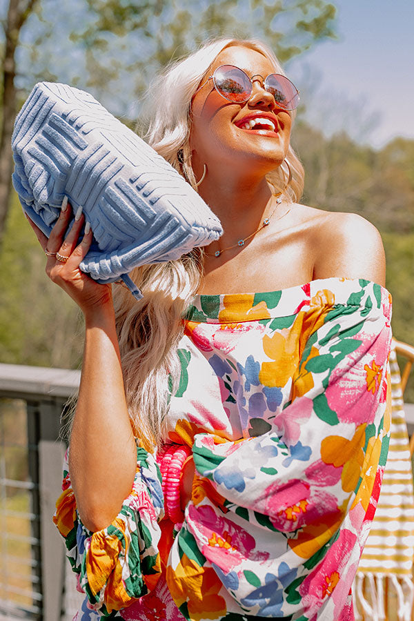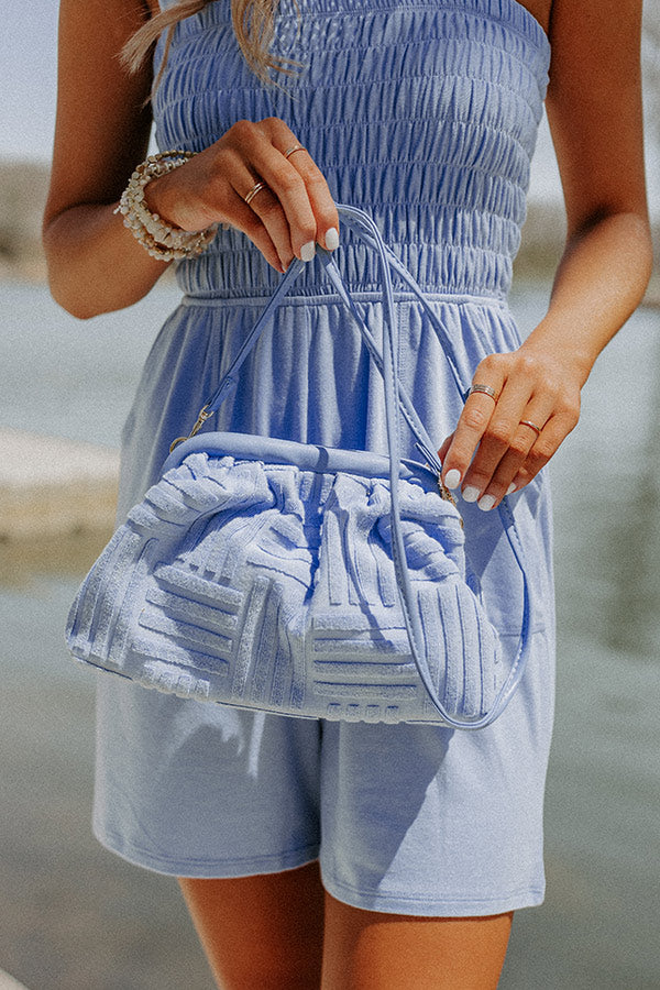 Stay on trend with our sky blue colored 'The Real Fling Crossbody' featuring terry cloth material, a shoulder strap, a pressure closure, and a spacious pouch silhouette!
