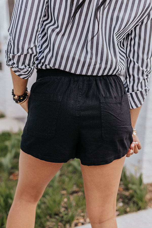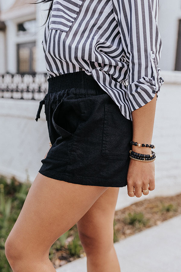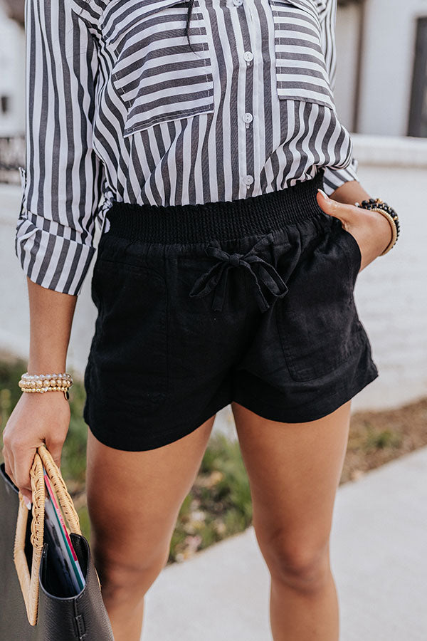 Stay cool and cozy throughout the summer in our darling black 'Redmond' shorts featuring soft lightweight linen-blend material, a smocked waistline with subtle ruffled trim detailing and a tie belt closure, accent side and back pockets, and a relaxed silhouette that ends in straight upper-thigh length hemlines! Measurements