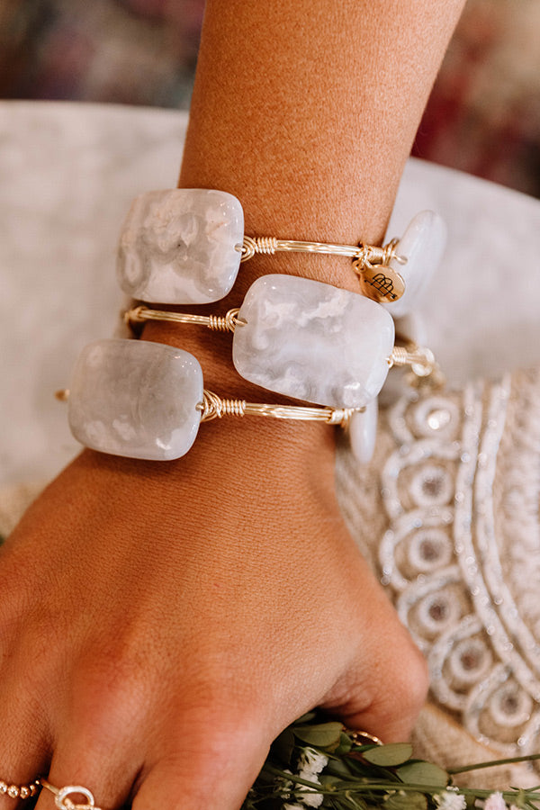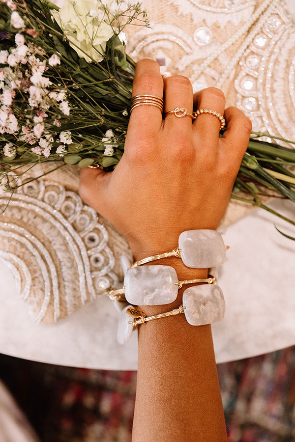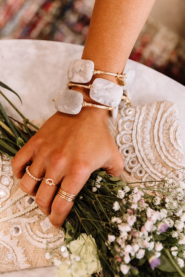 The "Rory" bracelet features a gold plated copper wire-wrapped bangle adorned with three grey stones!