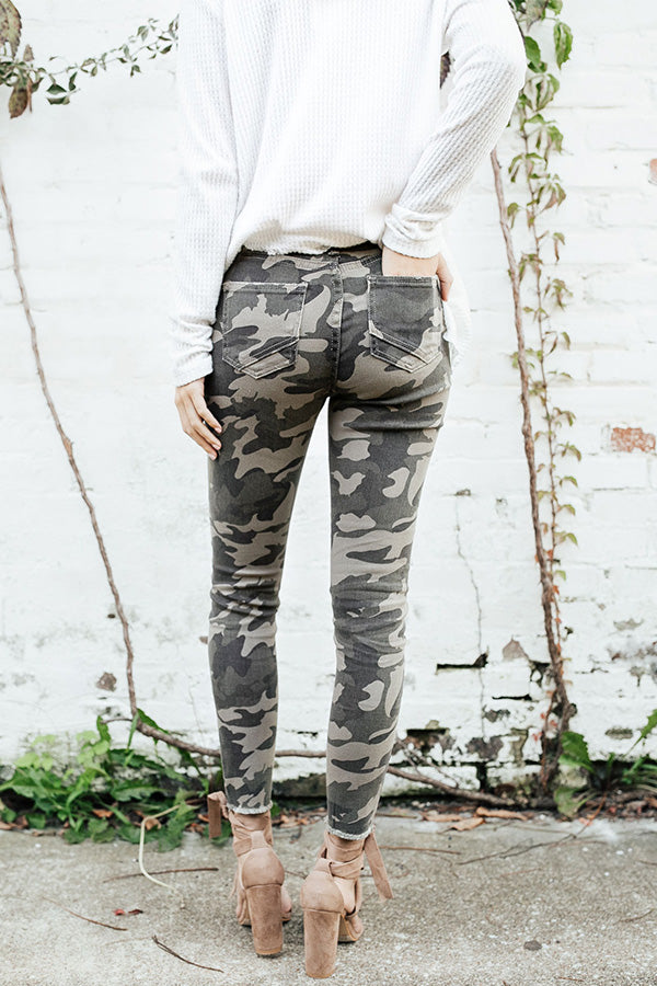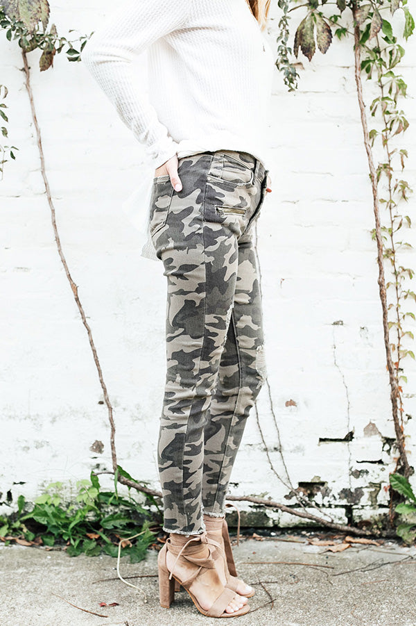 Camo may have initially been created for hunters, but we are always "hunting" for stylish new pieces to add to our closet... So, close enough! These chic camo skinnies have a flattering high-waisted fit, faux zip accent pockets, a distressed skinny pant leg & a frayed ankle length hem.