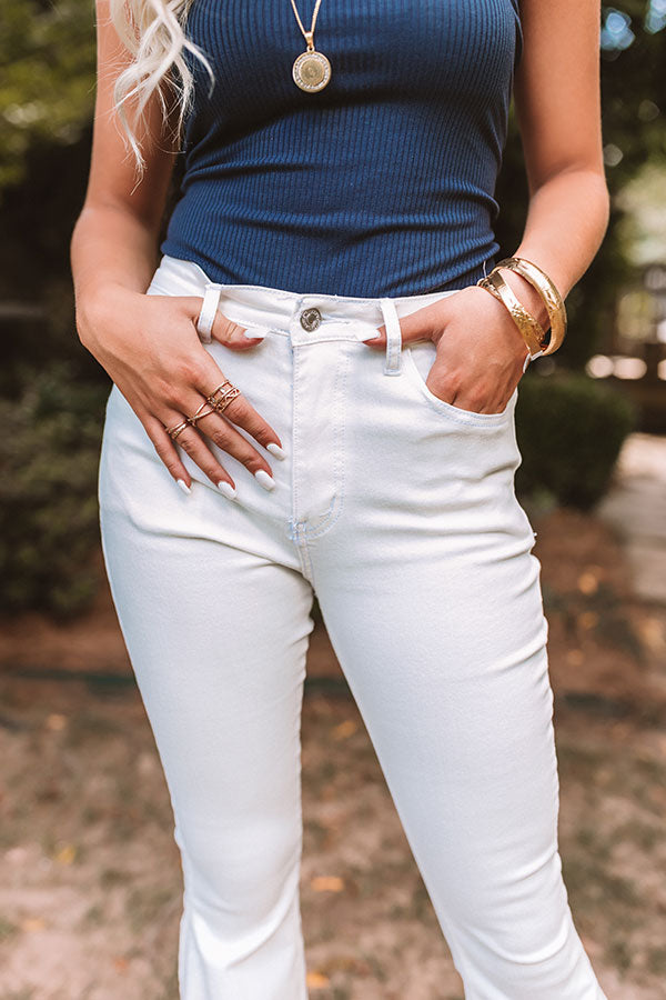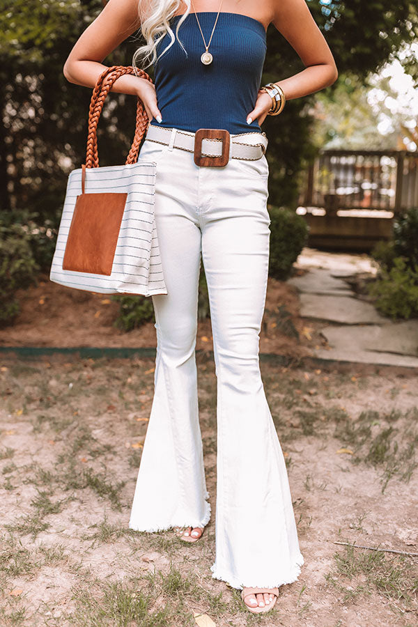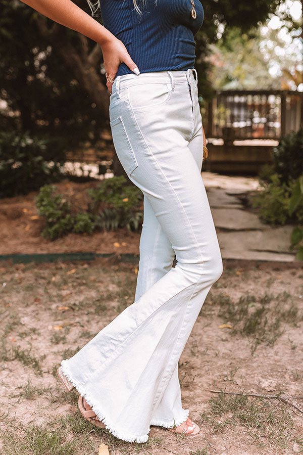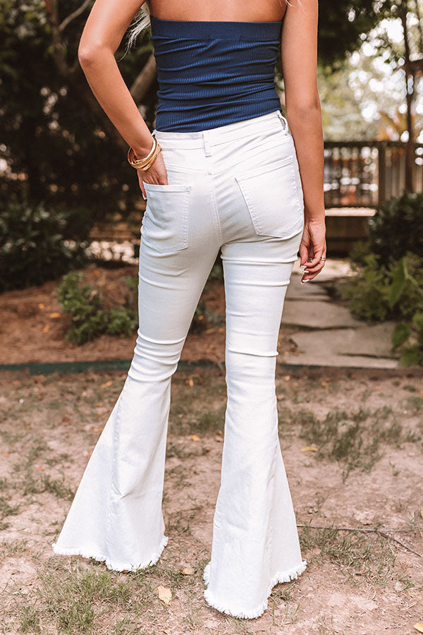 Stay groovy this summer with "The Rory" flares featuring lightweight stretchy white material, a high waistline with belt loops, a hidden zip fly with a button closure, four pocket cuts, and a form fitting silhouette that falls into oversized raw cut floor-length hemlines! These retro bottoms will take your from season to season when you wear with your favorite open toed heel, trendy sunnies, and tank top in the summer and with booties, a chic tote, and a sweater in the fall! This item does not include pocket cuts.
