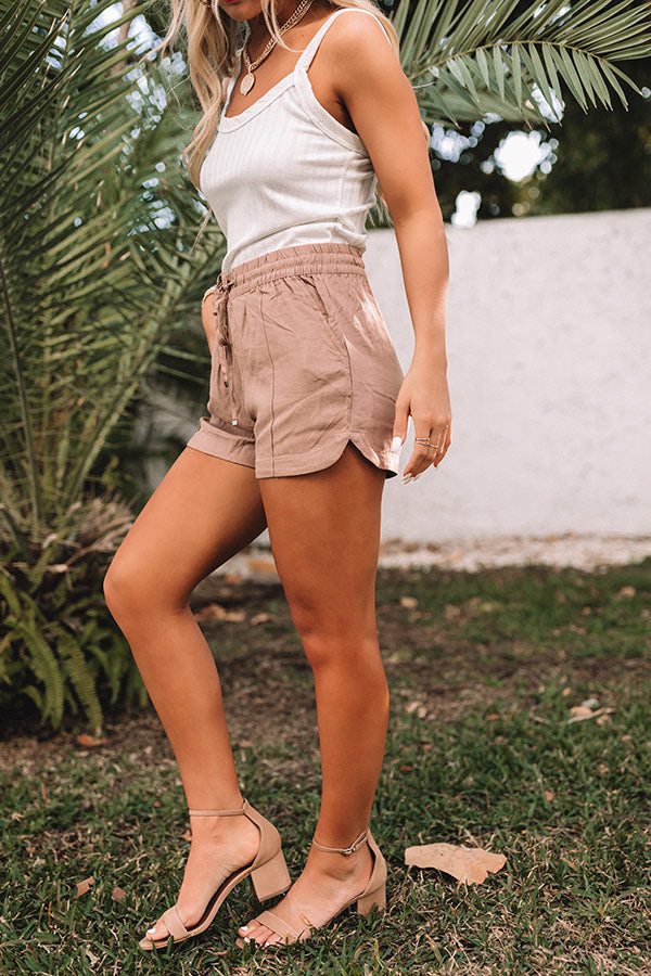 Keep your summer style versatile with our casual mocha colored 'Rowe' shorts featuring soft lightweight material, a wide smocked waistline with a tie closure, side pockets and a single back pocket cut, exposed center cut accent seams, and a figure flattering silhouette that falls into rounded upper-thigh length hemlines with v-notched sides! Measurements