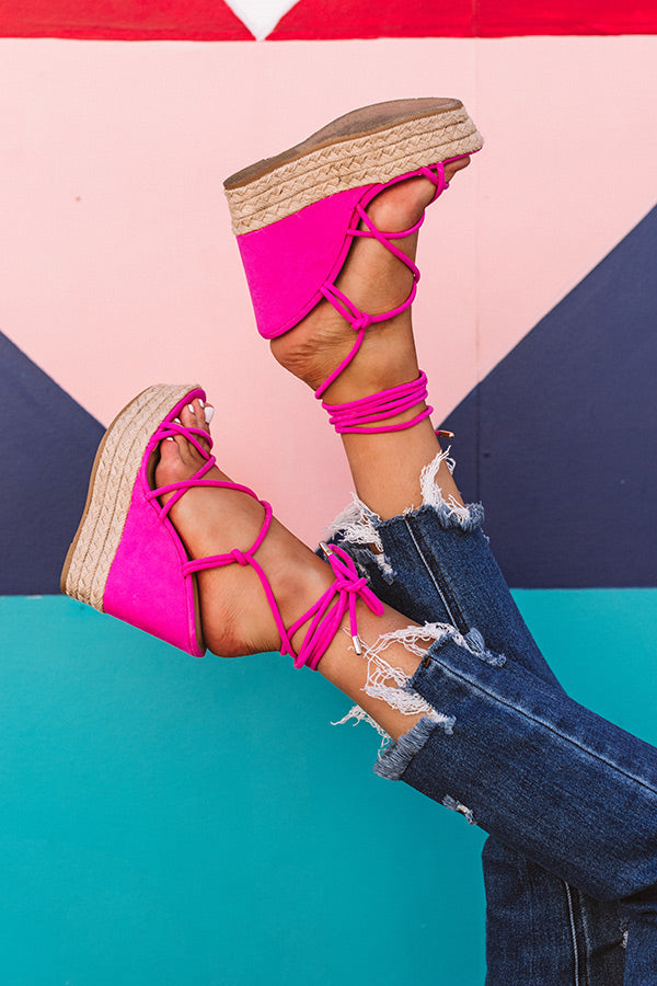 Happiness is only one pair of shoes away, so don't hesitate to add our hot pink "Roxana" wedge to your cart with its faux suede material, a 5-inch wedge height with braided platform soles, rounded open toes, and a lace up silhouette!