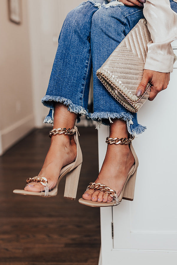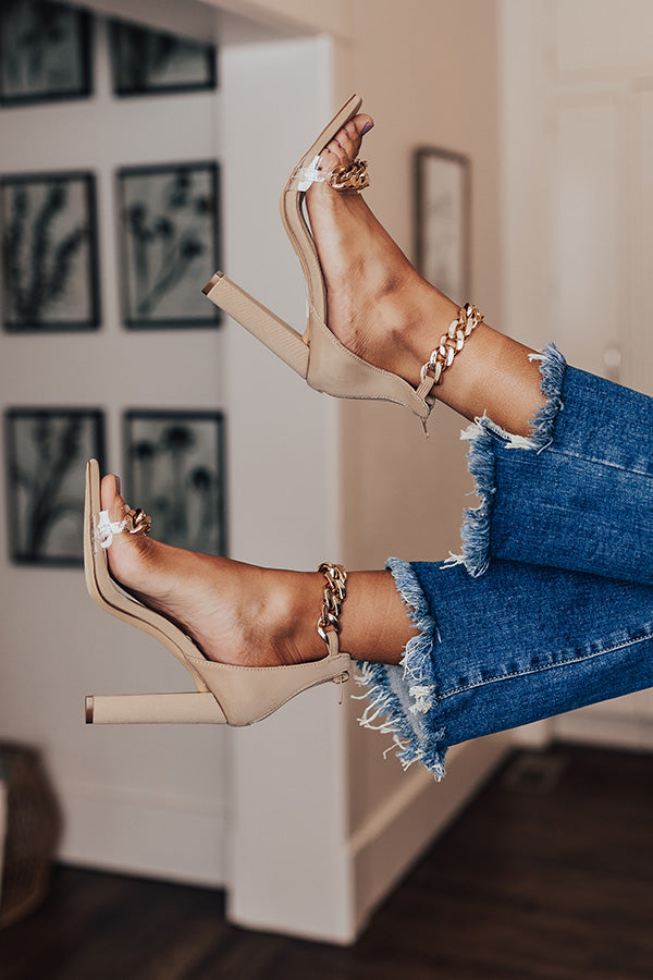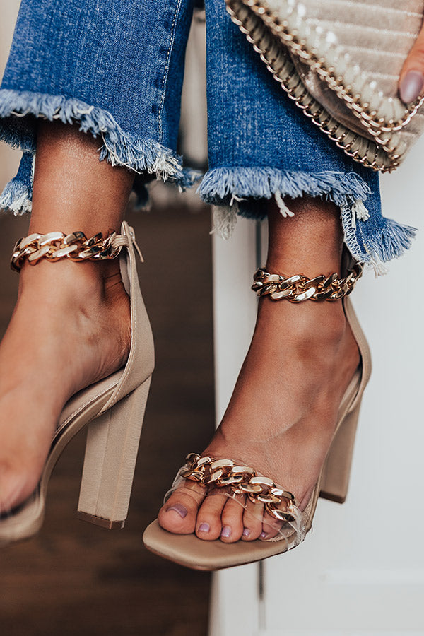 Keep your standards and your heels with our luxe beige colored 'Roxleigh Heel' featuring two cold chain straps, a closed heel with a zip closure, a square open toe, and a 4.5-inch block heel! This heel runs more true to size.