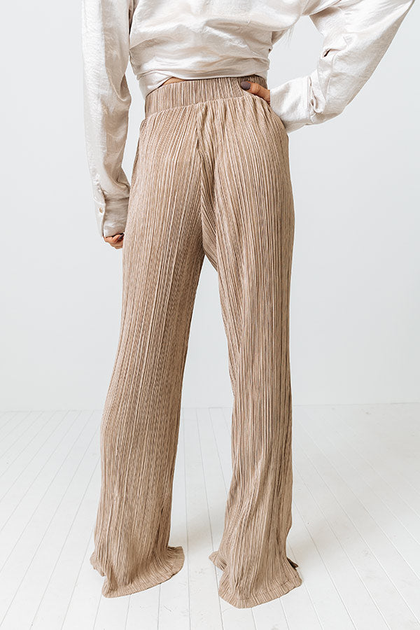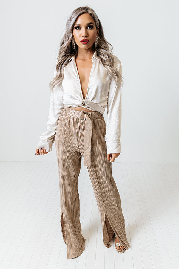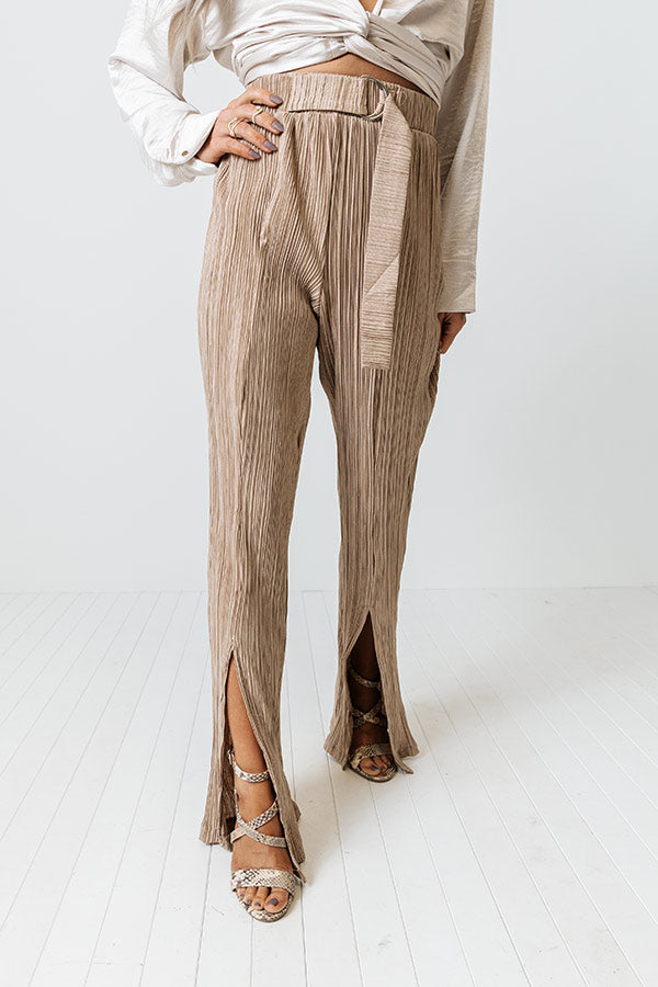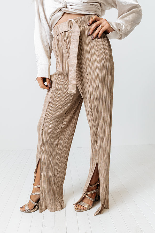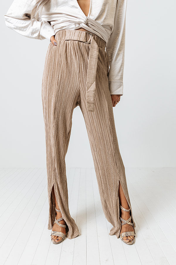 We guarantee you won't find a more elegant and comfortable piece to wear to the office than our sophisticated iced latte colored 'Saleen' pants featuring lightweight and breezy material with pleated texturing, a high waistline with a matching belt, and a relaxed but chic silhouette that falls into ankle-length split hemlines!