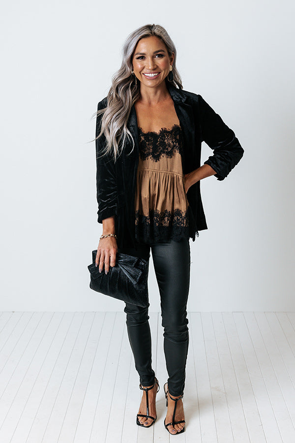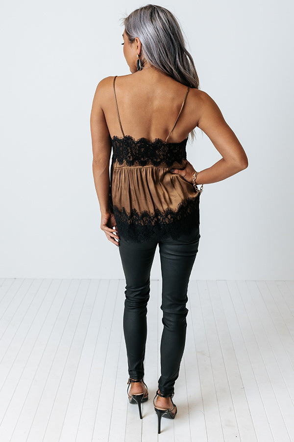 Get ready for the holidays in our flirty mocha colored 'Sansa' tank featuring sleek satin-like material with intricate black lace trim detailing, a dainty neckline with adjustable spaghetti straps, and a relaxed silhouette that falls into an uneven hemline!