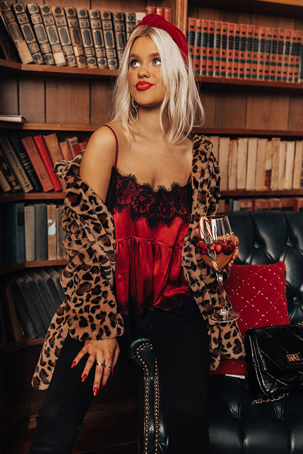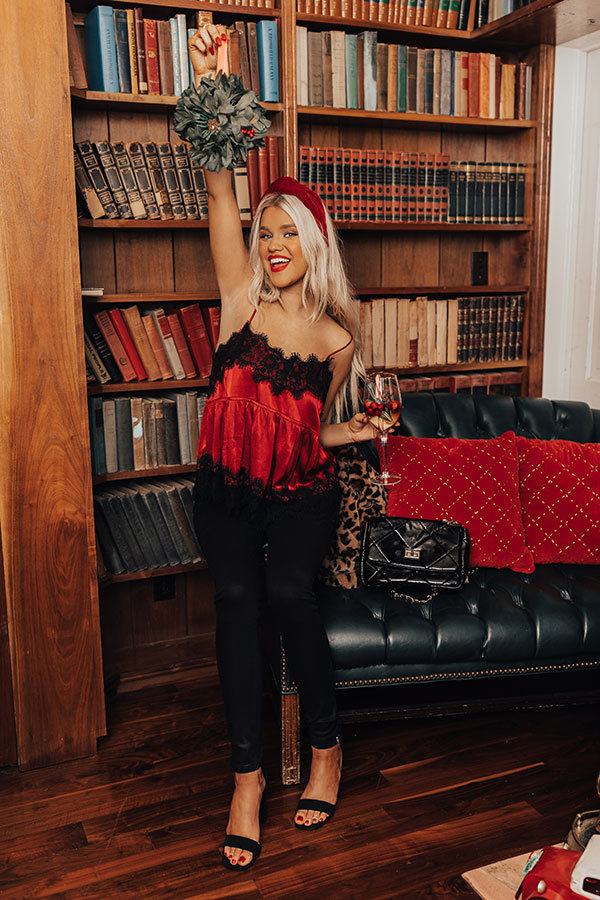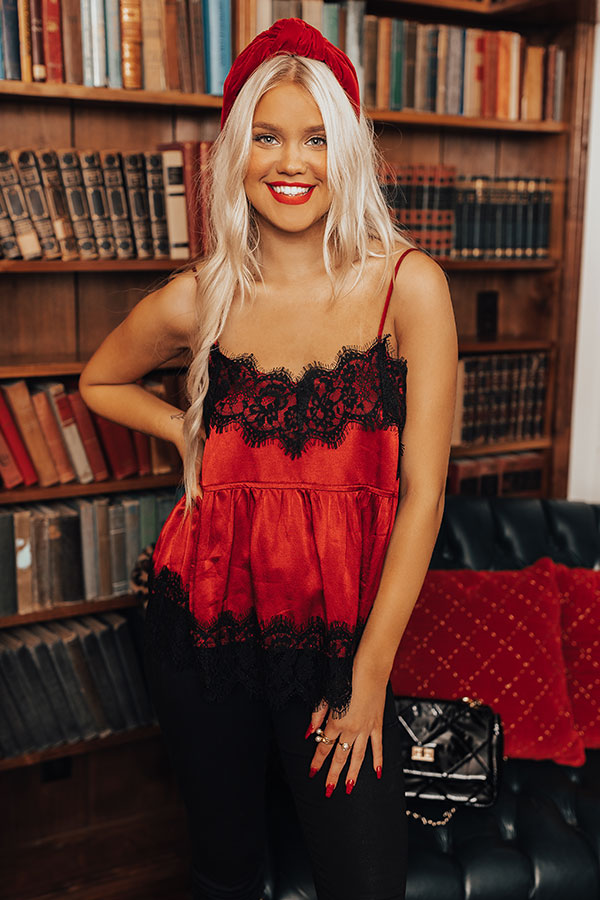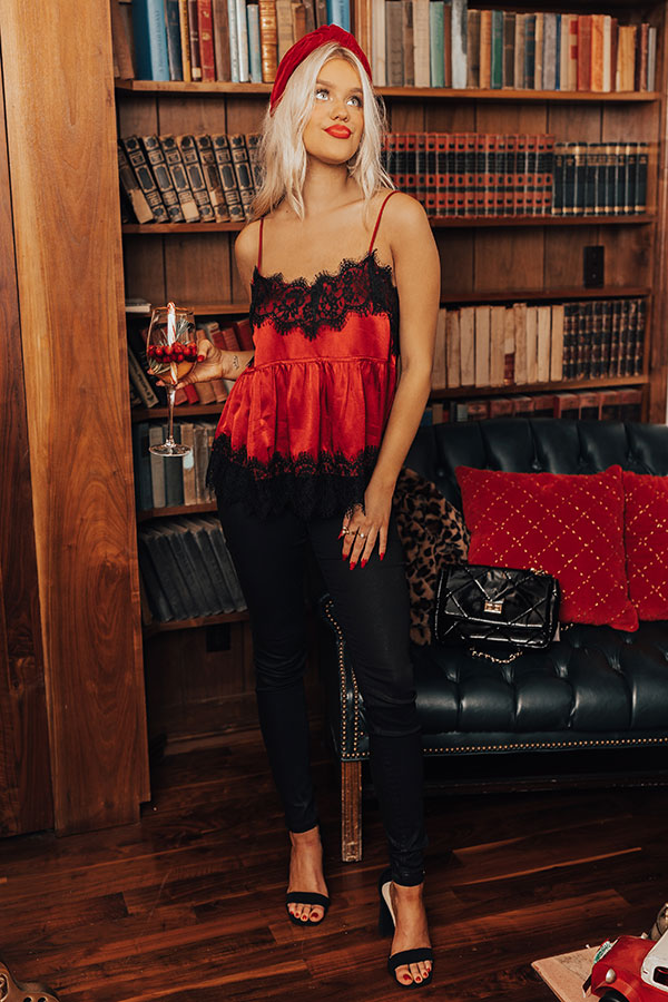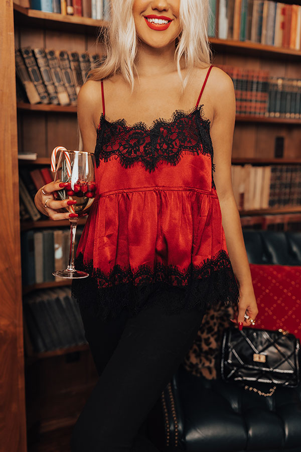 Get ready for the holidays in our flirty red 'Sansa' tank featuring sleek satin-like material with intricate black lace trim detailing, a dainty neckline with adjustable spaghetti straps, and a relaxed silhouette that falls into an uneven hemline! Measurements