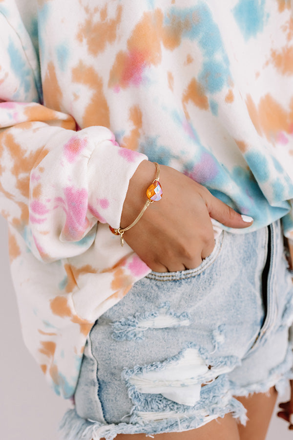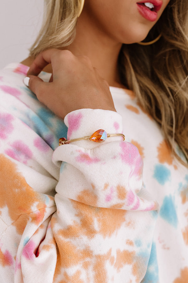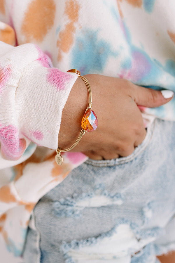 The "Sarah" bracelet features a gold plated copper wire-wrapped bangle adorned with three orange acrylic pieces!